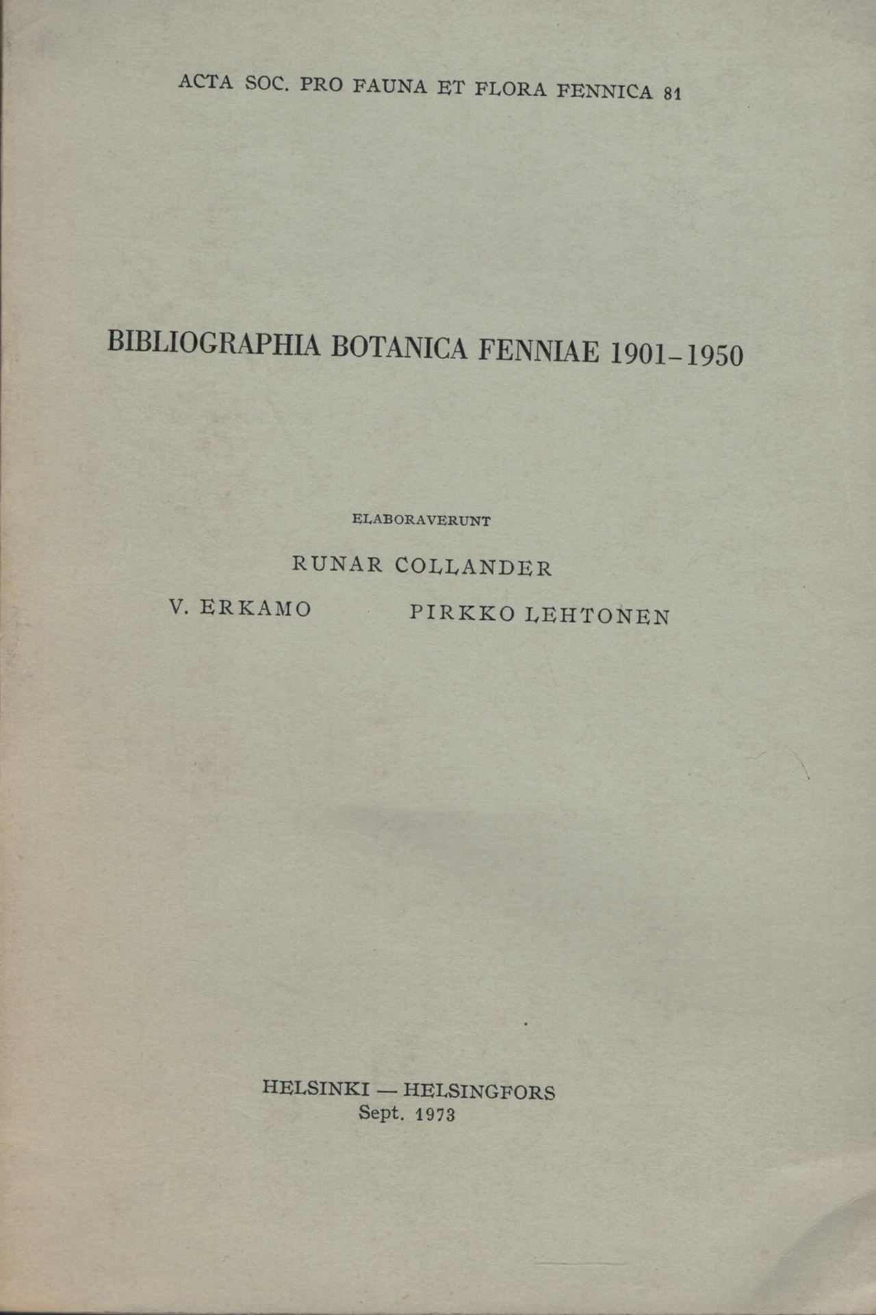 Collander, Runar, V. Erkamo and Pirkko Lehtonen: Bibliographia Botanica Fenniae 1901-1950. 1973. (Acta Soc.Pro Fauna et Flora Fennica, 81). 647 p. gr8vo. Paper bd. (45455) 13.91