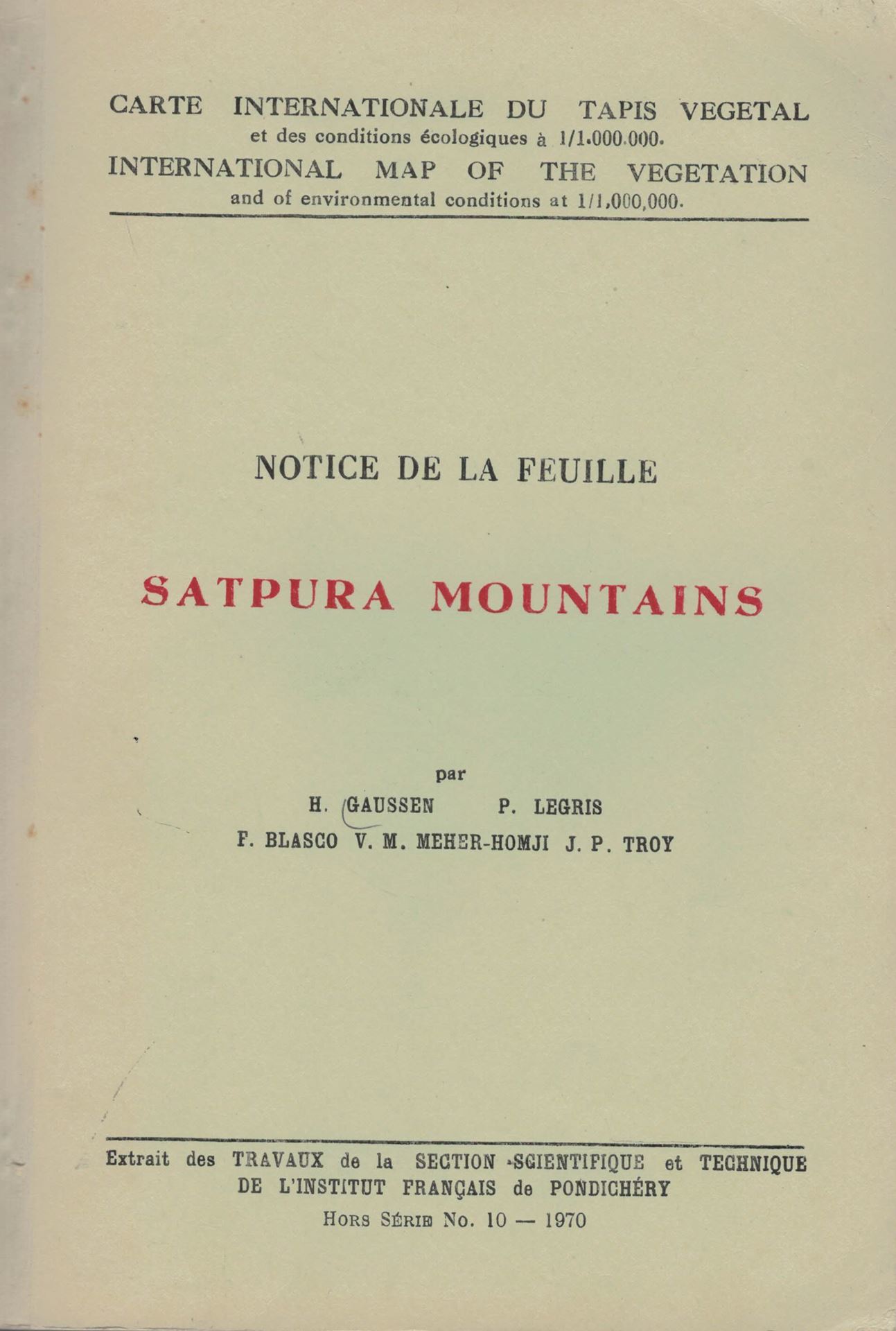 Gaussen, H., P. Legris and others: Notice de la feuille Satpura Moun-tains. 1970. (ex. Trav. Sct. Sci. Techn. Inst. Pondichery, Hors Ser. 10)12 photos. 3 tabs. 132 p. Et: Carte Internationale du tapis vegetale: Satpura Mountains. Col. Echelle 1: 1 000 000. (4384) 27.82