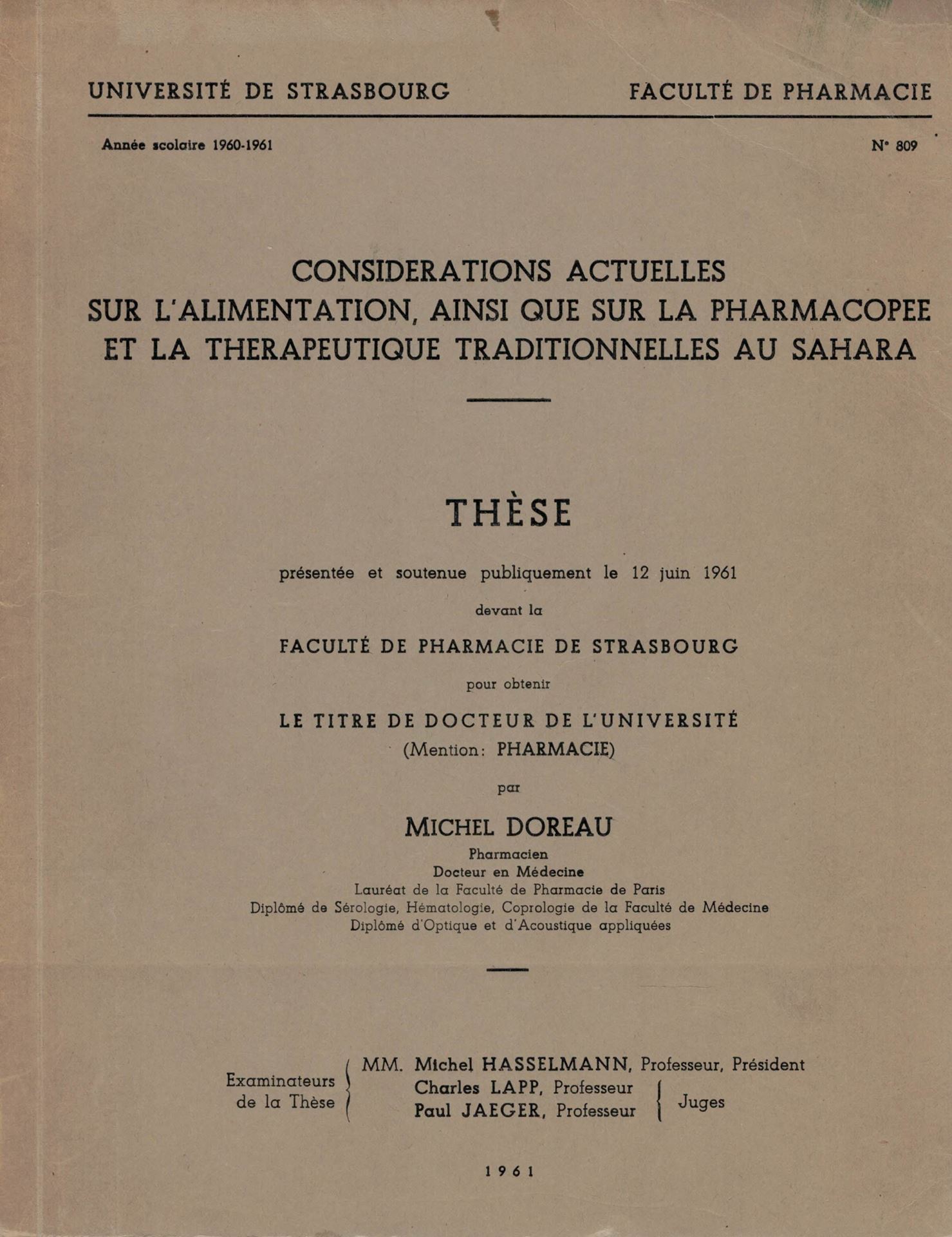 Considérations actuelles sur l'alimentation, ainsi que sur la pharmacopée et la thérapeutique tranditionelles au Sahara. 1961. (Thèse, Univ. Strasbourg, Fac. Pharmacie, no. 809).m 108 p. 4to. Paper bd.