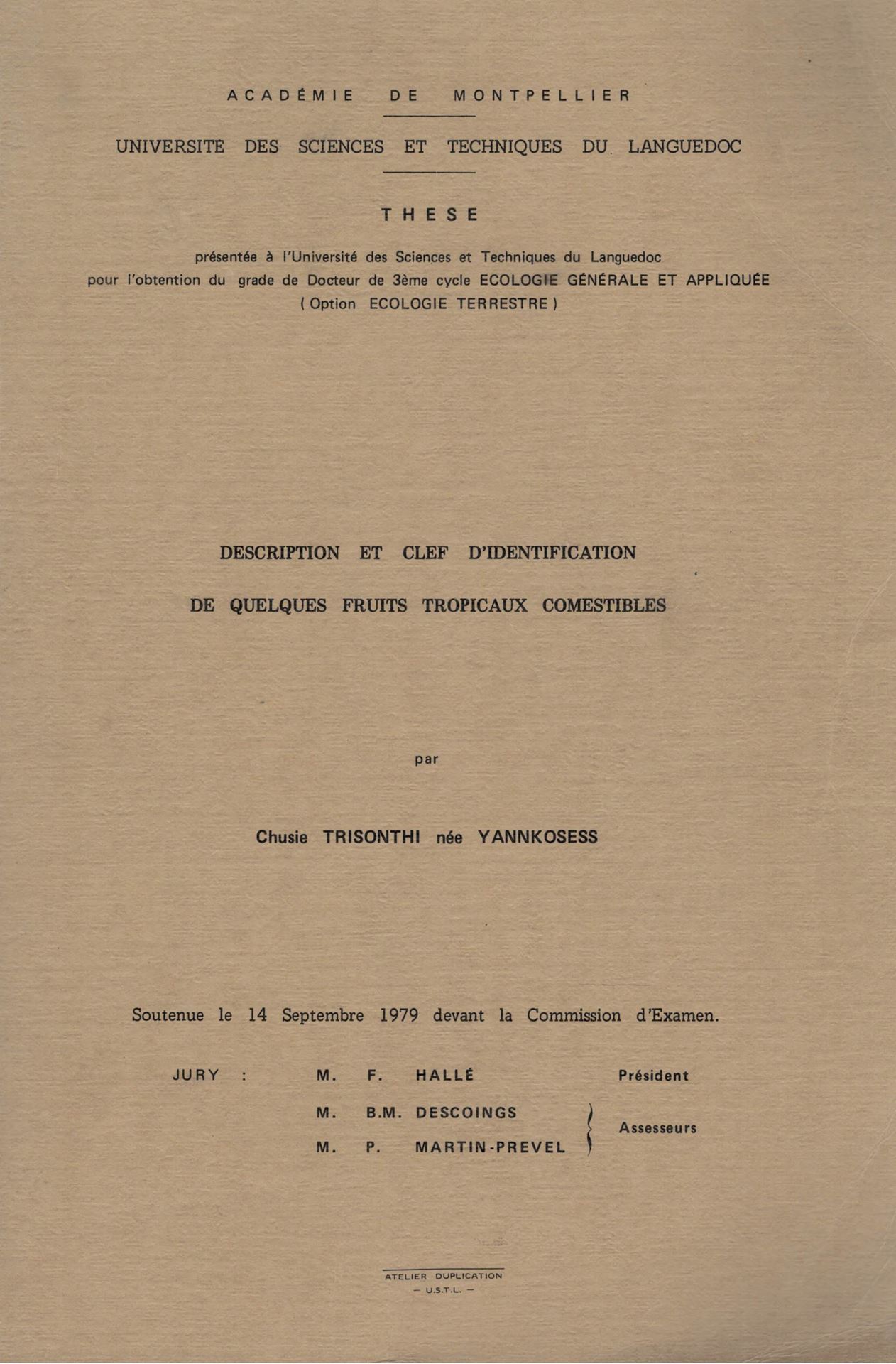 Déscription et Clef d'Identification de Quelques Fruits Tropicaux Comestibles. 1979. (Thèse). illus. 174 p. 4to. Paper bd.