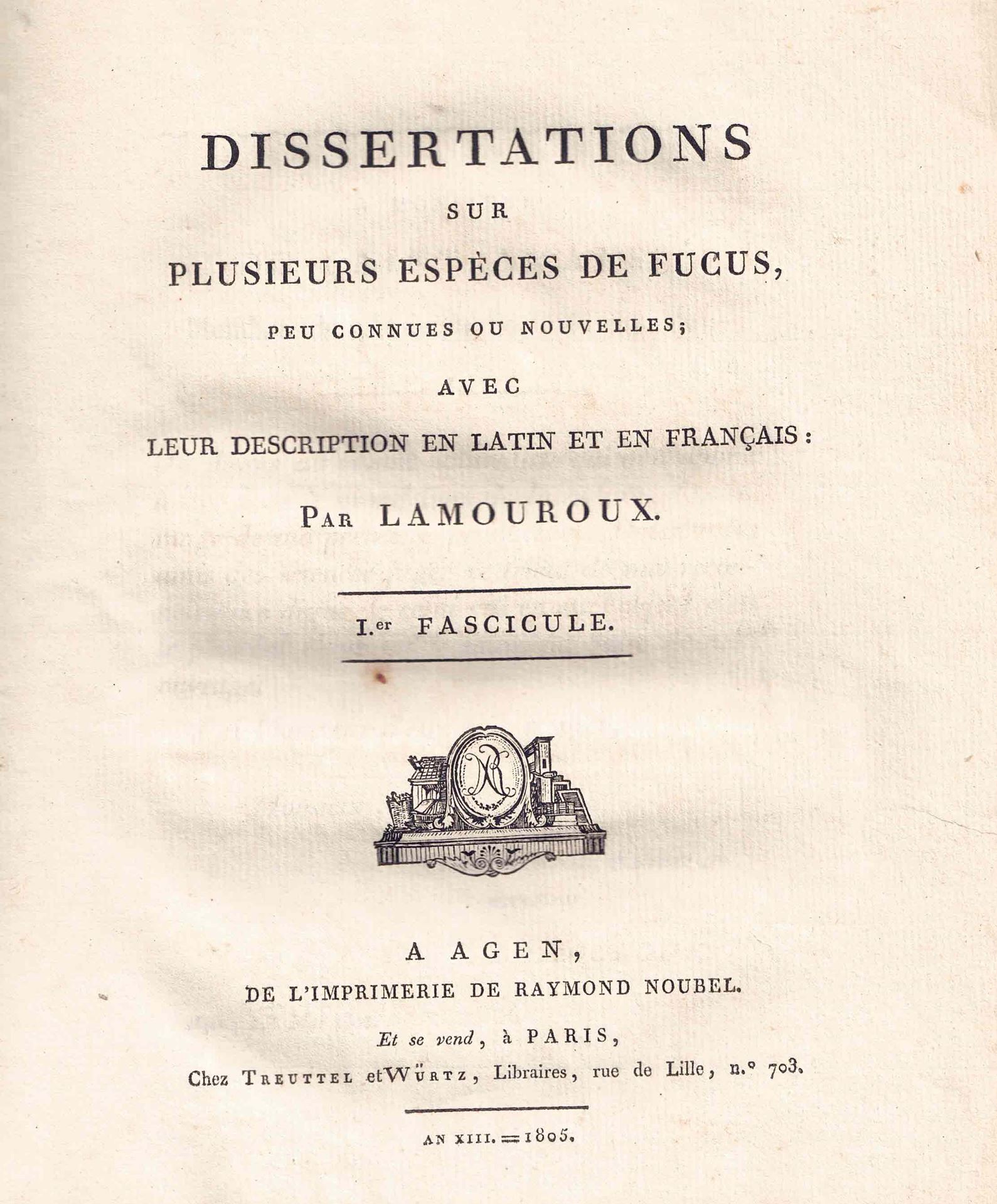 Dissertations sur Plusieurs Espècs de Fucus Peu Connues ou Nouvelles Avec Leurs Description en Latin et en Francais. 1er Fascicule (= all published). 36 engraved plates (uncoloured). XXIV, 83p. 4to. Hardcover.