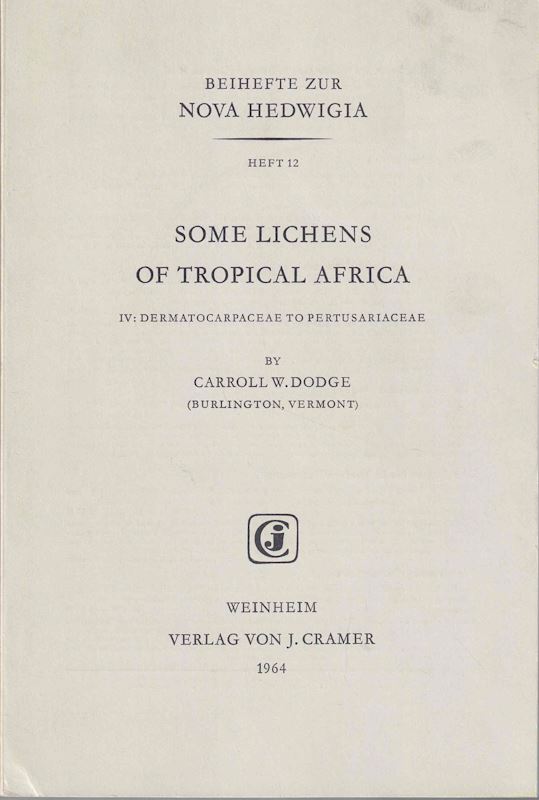 DODGE, Carroll W.: Some Lichens of Tropical Africa, 4: Dermatocarpaceae to Pertusariaceae. 1964. (Nova Hedwigia, Beih. 12). IV,282 p. gr8vo. Paper bd. (2976) 41.00 (ISBN 978-3-7682-5412-0)