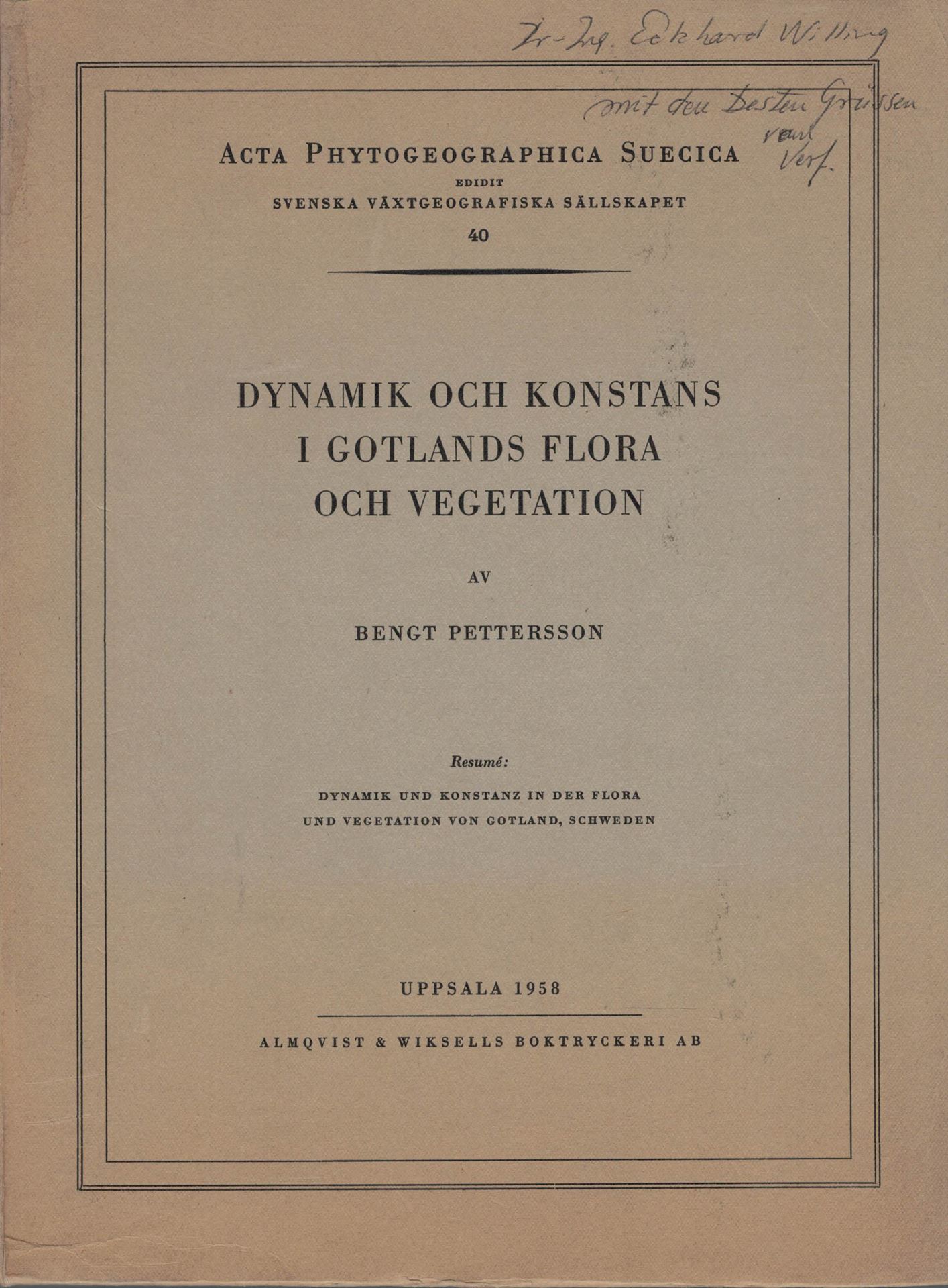 Pettersson, Bengt: Dynamik och konstans i Gotlands flora och vegetation. (With resume: Dynamik und Konstanz in der Flora und Vegetation von Gotland).1958.(Acta Phytogeogr.Suec.40).124 figs.288 p.4to.Paper bd. (86570) 30.00