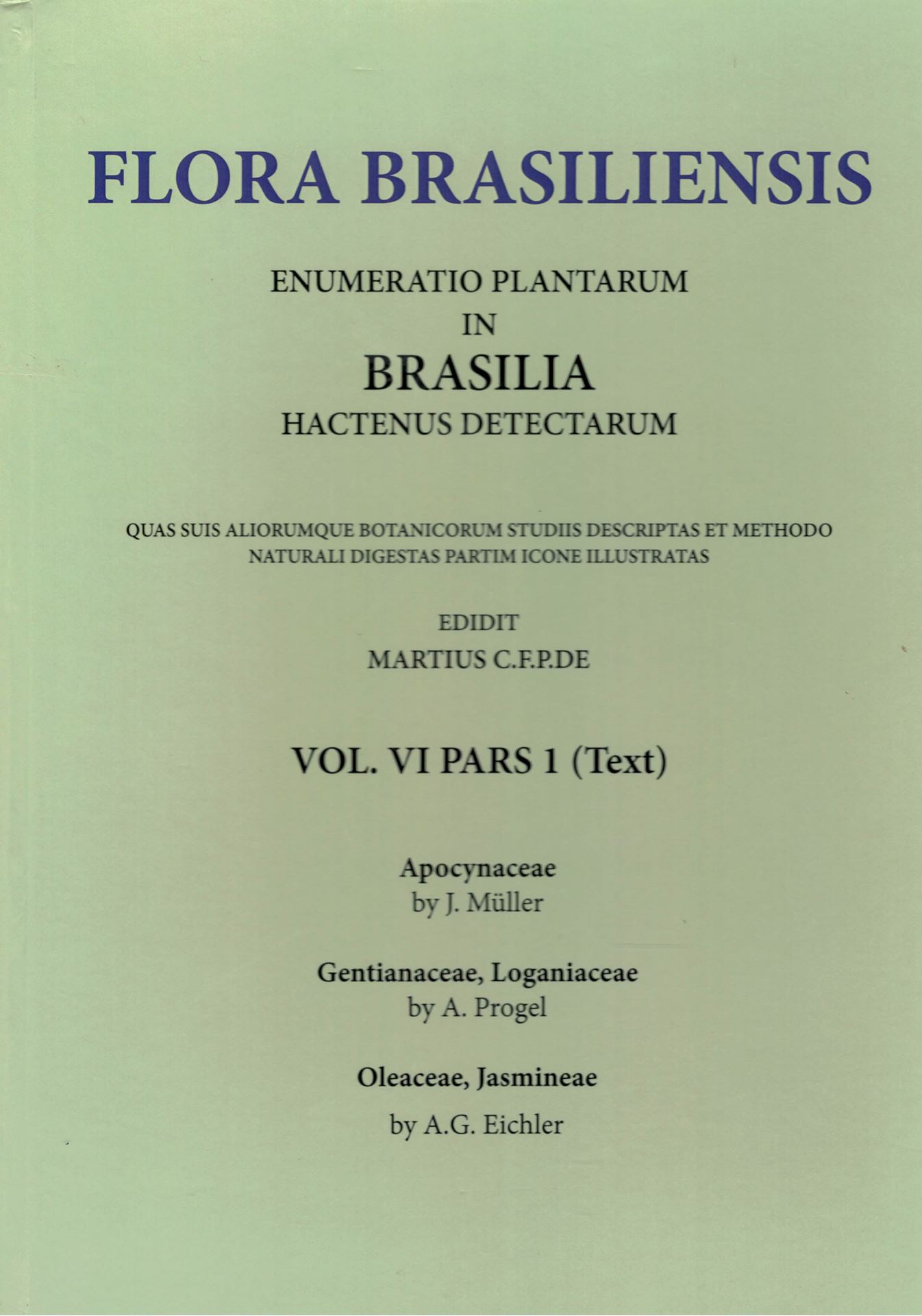 Ed. by. C.F.P. von Martius, A.G.Eichler & I.Urban Volume 06:01:J.Mueller: Apocynaceae/ A.Progel: Gentianaceae, Loganiaceae A.G. Eichler: Oleaceae, Jasmineae. 1860-1868. Reprint 2020. 85 plates. 340 p. Paper bd.