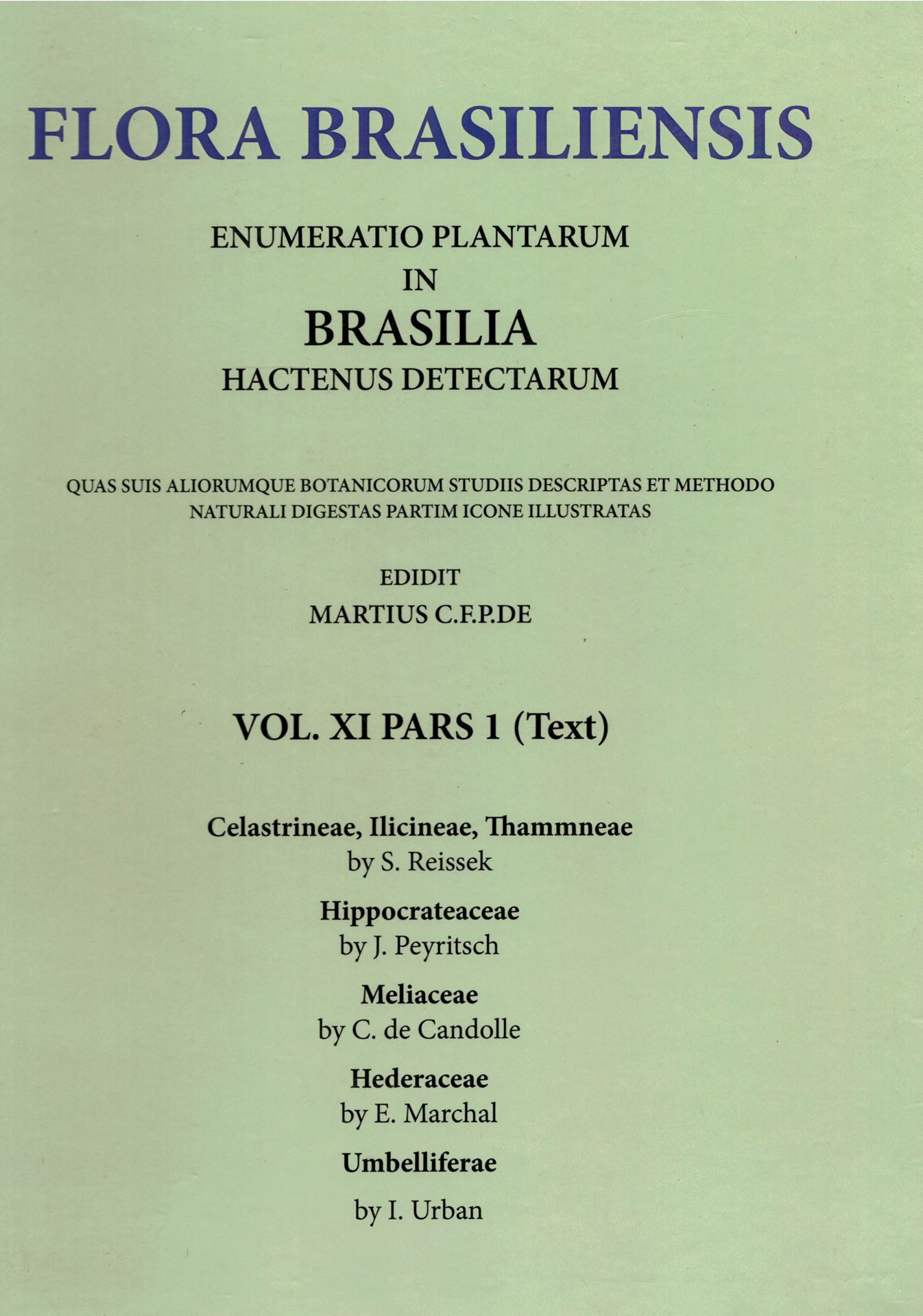 Ed. by C.F.P. von Martius, A.G.Eichler & I.Urban: Volume 11:01: S.Rissek: Cealstrineae, Ilicineae, Rhamneae/ J.Peyritsch: Hippocrateaceae/ C. de Candolle: Meliaceae/ E.Marchal: Hederaceae/ I.Urban: Umbelliferae. 1861-1879. (Reprint 2002). 91 plates. 370 p. Paper bd.