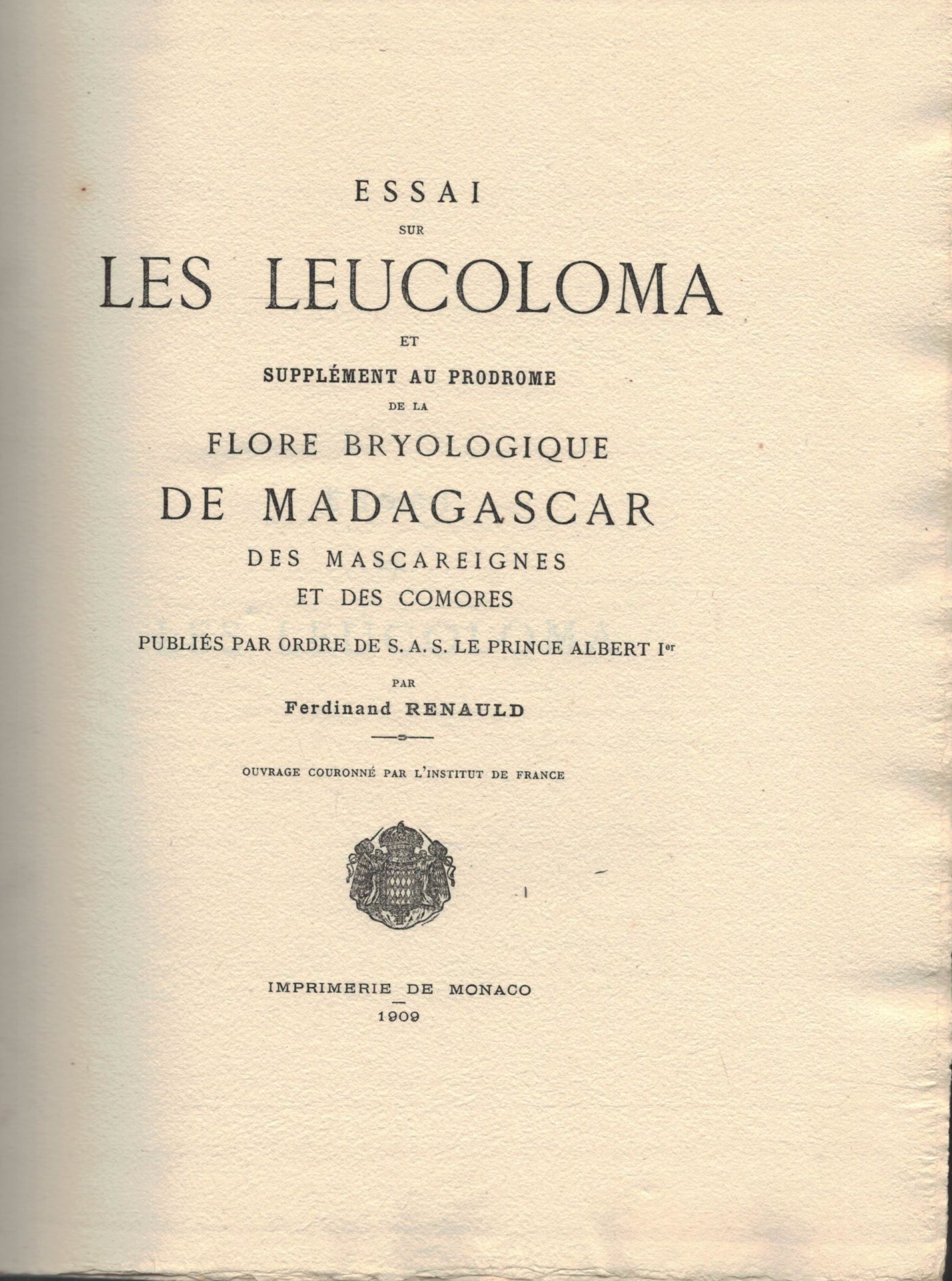 Essai sur les Lucoloma et Supplément au Prodrome de la Flore Bryologique de Madagascar, des Mascareignes et des Comores. 1909. (Mémoires et Documents publiés par ordre de S. A. le Prince Albert Ier, Prince Souverain de Monaco). 24 pls. 139 p. 4to Hardcover.