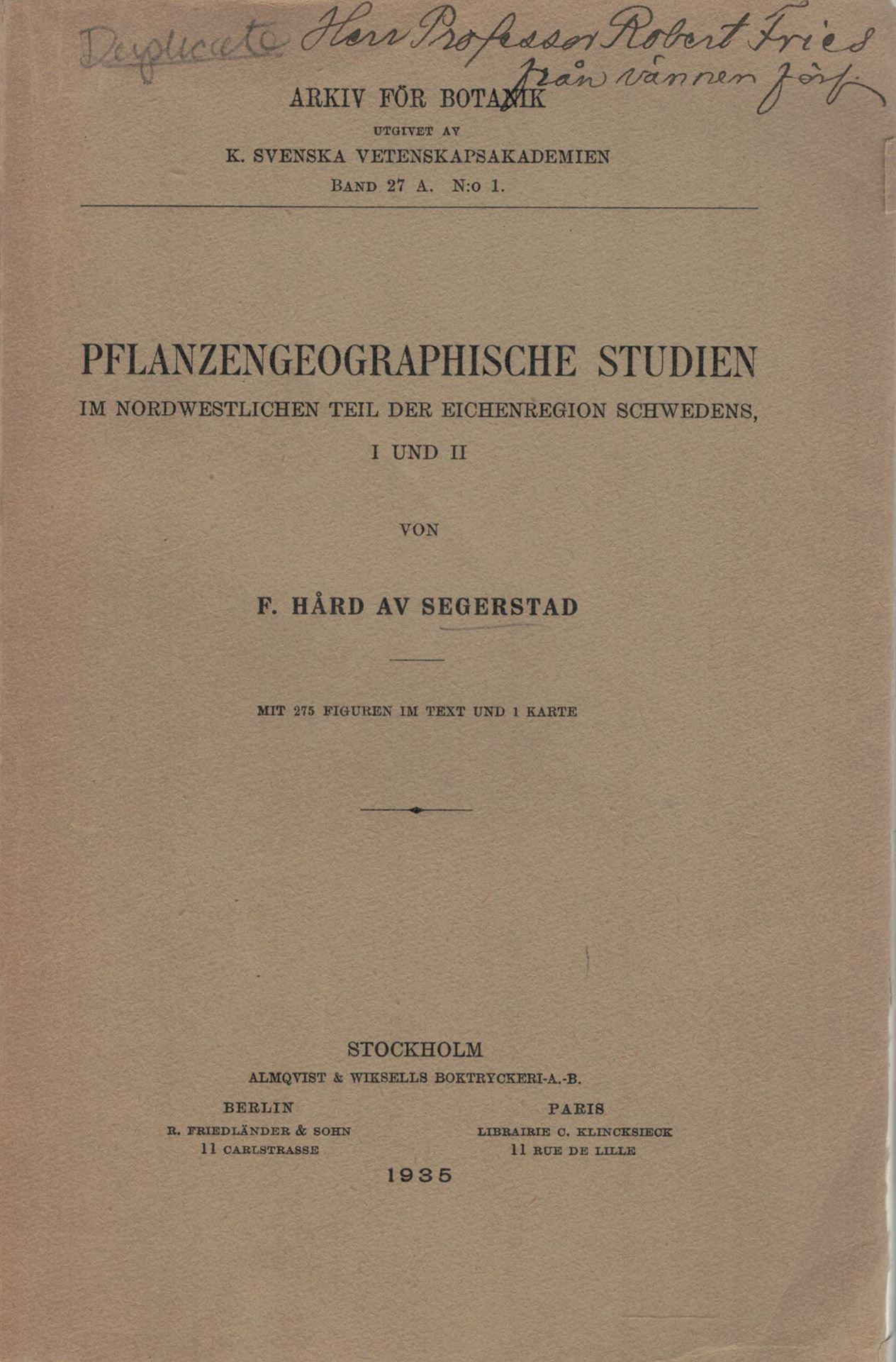 Hard av Segerstad, F.: Pflanzengeographische Studien im nordwestlichen Teil der Eichenregion Schwedens.1 & 2.1934. (Arkiv foer Botanik,27A, No.1).1 Karte.275 Verbreitungskarten.405 S.8vo.Broschiert. 35.31 (5002)