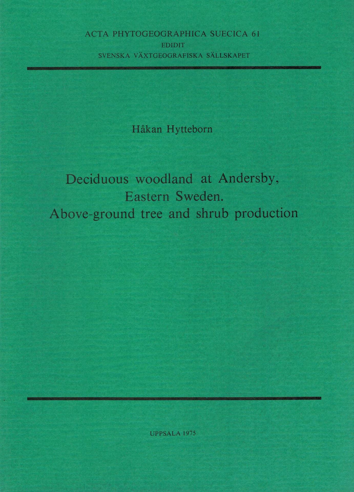 HYTTEBORN, H.: Deciduous Woodland at Andersby, Eastern Sweden, Above- Ground Tree and Shrub Production. 1975. (Acta Phytogeogr. Suec., 61). 35 tabs. 32 figs. 96 p. gr8vo. Paper bd. (5632) 10.70