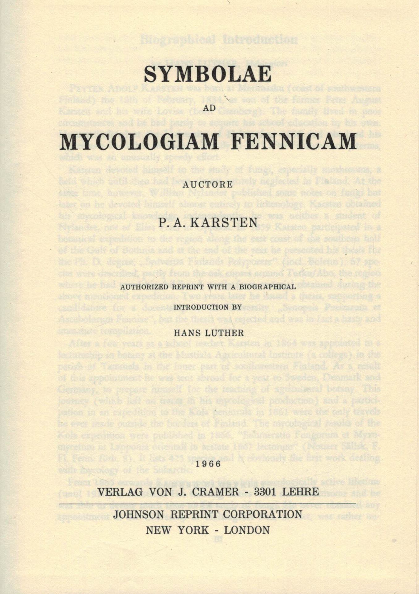 Karsten, P.A.: Symbolae ad Mycologiam Fennicam.Helsingfors 1870-1895. Reprint 1966).VIII,384 p.Cloth.(5865) 58.00 (ISBN 3-7682-0353-0)