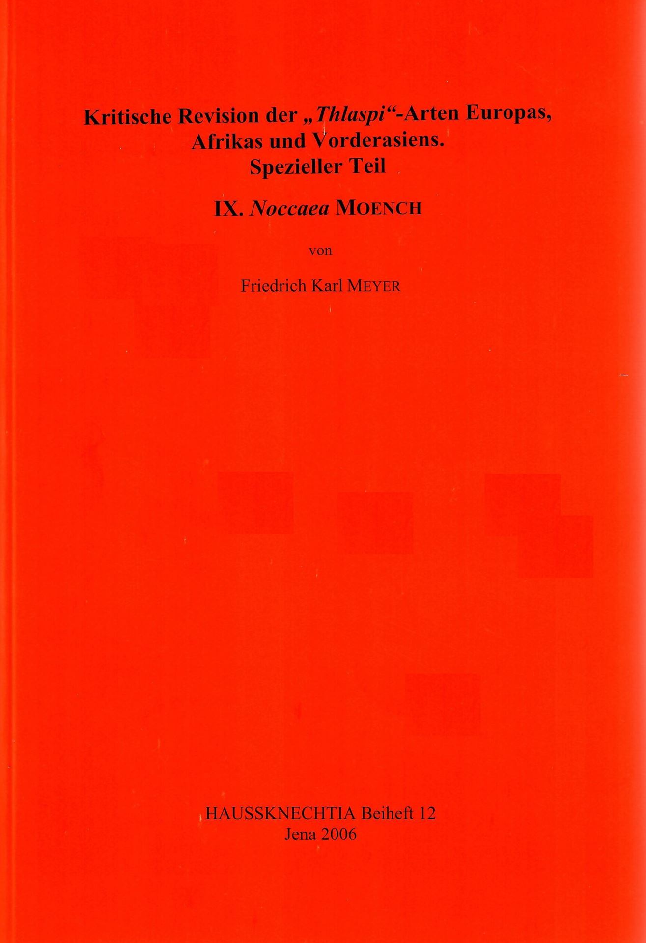 The present revision of Noccaea is the ninth and last in a series of papers published in "Haussknechtia" between 2001 and 2006, each treatingone of the segregate genera, to name: Thlaspi s. str., Neurotropis,Microthlaspi, Thlaspiceras, Noccidium, Kotschyella, Callothlaspi, andRaparia. It ist not a world monograph, because the area of Noccaea farexceeds the core area of former Thlaspi on which Meyer has concentratedTo the 67 species and 10 additional subspecies here recognised, perhapshalf as many will have to be added when N and E Asia plus extra-tropical America are considered. Even so, a solid foundation has beenlaid. The detailed descriptions and extensive specimen citations, together with the large amount of careful if artless drawings ofdiagnostic details (apparently all by the author), suffice to makehis taxonomic judgement understood.