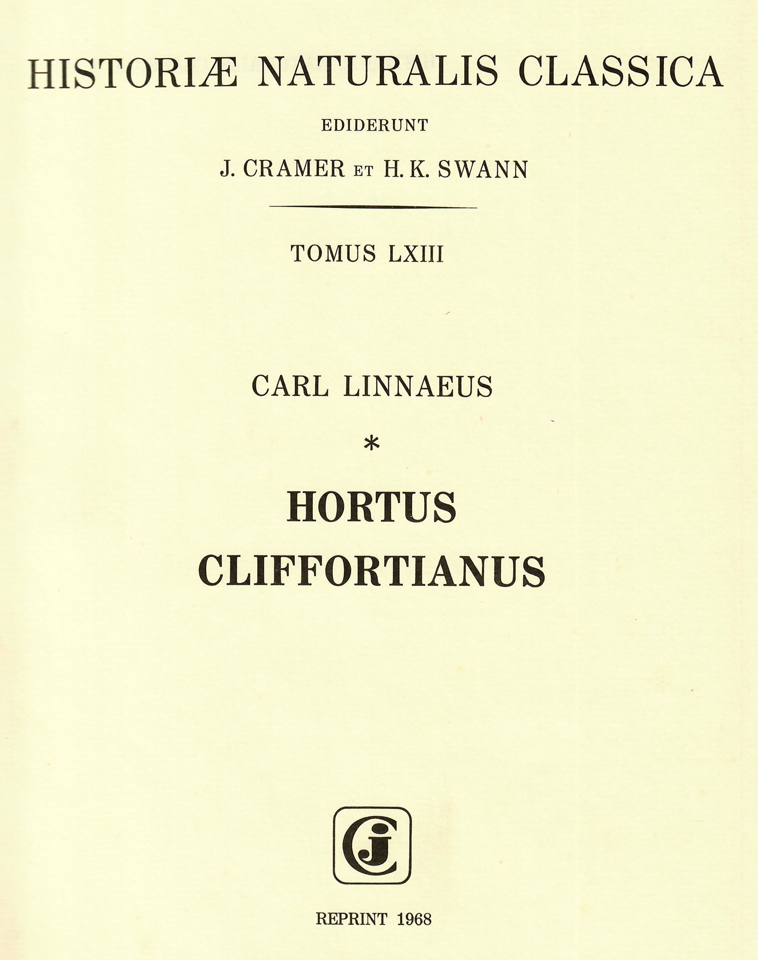 LINNAEUS, Carolus: Hortus Cliffortianus plantas exhibens, quas in hortis tam vivis quam siccis Hertecampi... Amsterdam 1737. (Reprint 1968, Hist. Natur.Classic.,63). 37 pls. 532 p. Folio. Cloth. (6361) 123.00 (ISBN 978-3-7682-0543-6)