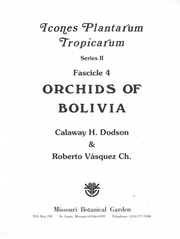 DODSON, Calaway H. and Roberto VASQUEZ Ch.: Orchids of Bolivia. 1989. (Icones Plant.Trop. Series II: Fasc. 4). 100 full-page black & white drawings. distrib.maps and explanative text. 4to. Unbound. 26.75 (41928)