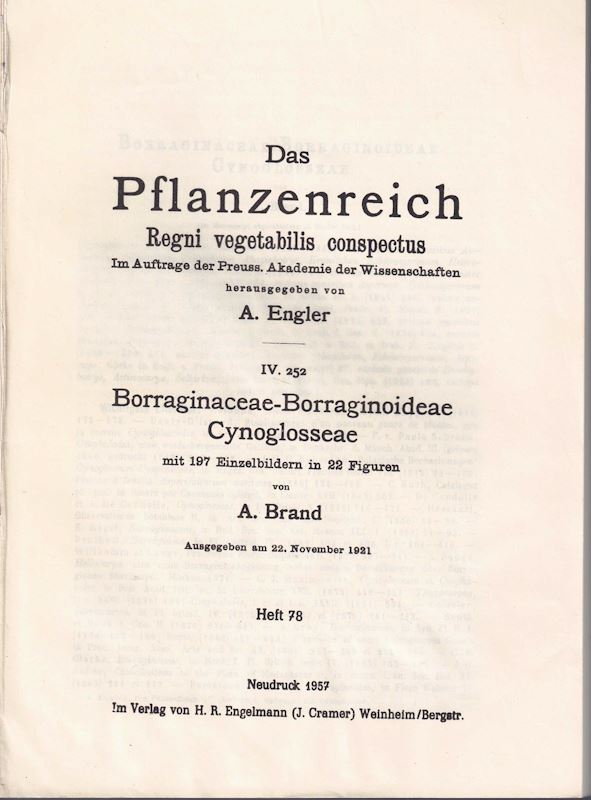 PFLANZENREICH (REGNI VEGETABILIS CONSPECTUS): Begr. von A. Engler, fortgefuehrt von L.Diels. Heft 078: Brand, A.: Boraginaceae-Boraginoi- deae, Cynoglosseae. 1921. (Reprint 1991). 197 figs. 183 p. Paper bd. (3188) 36.38 (ISBN 978-3-7682-2078-1)