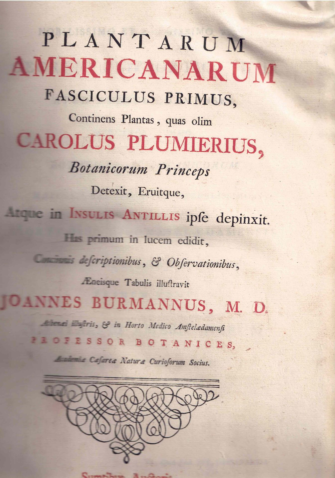 Plantarum Americanarum Continens Plantas, quas olim Carolus Plumerius, Botanicorum Principes, Detexit, Eruitque, Atque in Insulis Antillis ipse depinxit. Has primum in lucem edidit. Concinnis descrptionibus, & Observationibus Aeneisque Tabulis illstravit Joannes Burmannus, M. D....Sumptibus Auctoris...Fasciculi 1 - 10. Lug. Batav. 1755-1760. 263 pls. (1-25, 25*, 26-262). 262 p. Folio. Halfleath