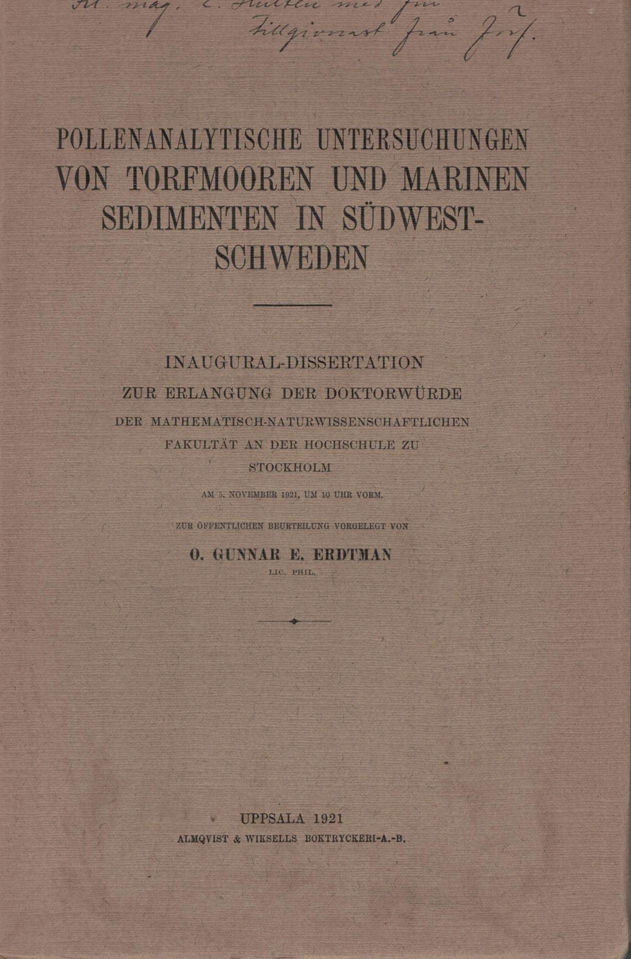 Erdtman, O. Gunnar: Pollenanalytiche Untersuchungen von Torfmooren und Marinen Sedimenten in Südwestschweden. 1921. (Diss.). 11 Tafeln. 173 p. gr8vo. Hardcover. (87144) 73.83