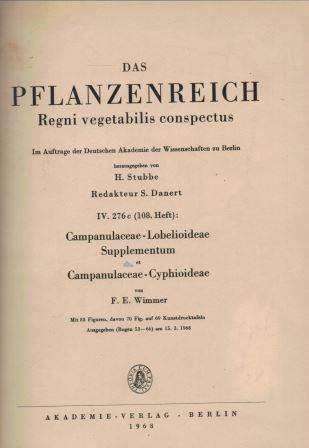 Regni Vegetabilis Conspectus. Heft 108: Wimmer, F. E.: Campanulaceae - Lobelioideae Supplementum et Campanulaceae - Cyphioideae. 1968. illus. 209 S. gr8vo. Halbleinen.