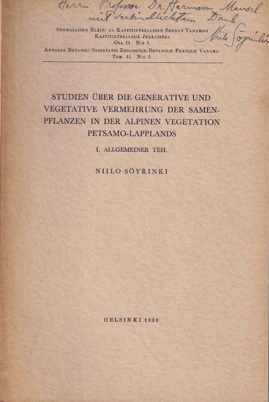 Söyrinki, Niilo: Studien über die generative und vegetative Vermehrung der Samenpflanzen in der alpinen Vegetation Petsamo-Lapplands. I. Allgemeiner Teil. 1938. (Annales Botanici Societatis Zoologicae - Botanicae Fennicae Vanamo, Tom. 11 No. 1). 20 Abb. 13 Tab. IX, 323 S. gr8vo. Broschiert.(83231) 29.96