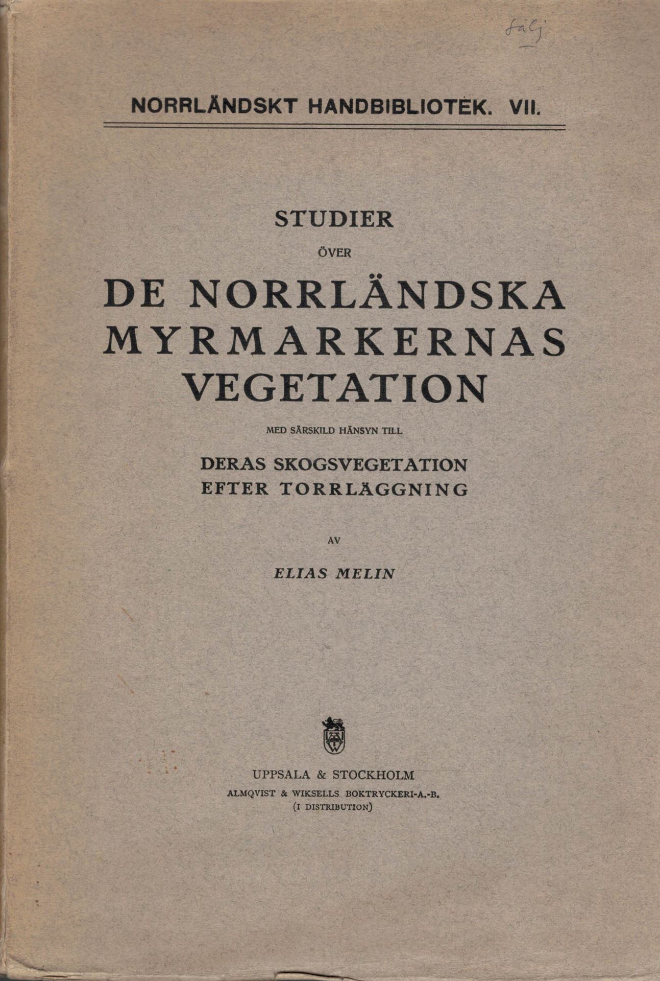 Melin, Elias: Studier över de Norrländska Myrmarkernas Vegetation med Särskild Hänsyn till deras Skogsvegetation efter Torrläggning. 1917. (Norrländskt Handbibliotek, VII). 11 pls. XII, 428 p. gr8vo. Paper bd. (83356) 31.03