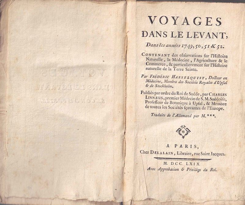 Voyages dans le Levant, Dans les années 1749,50,51 & 52. Contenant des observations sur l'Histoire naturelle, la Médecine, L'Agriculture & le Commerce, & particulierement sur l'Histoire naturelle de la Terre Sainte. Paris 1769. 201 p. 8vo.