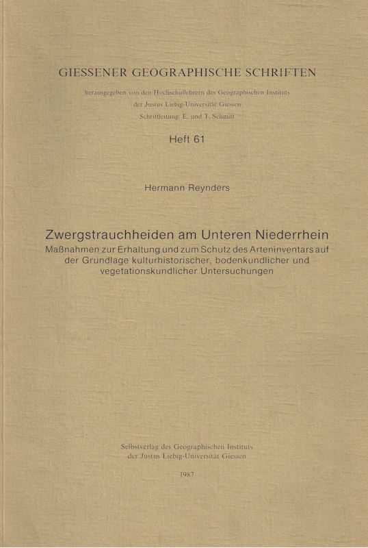 Zwergstrauchheiden am Unteren Niederrhein. Massnahmen zur Erhaltung und zum Schutz des Arteninventars auf der Grundlage kulturhistorischer, bodenkundlicher und vegetationskundklicher Untersuchungen. 1987. (Giessener Geograph.Schriften, Heft 61). 34 Abb. 40 Tab. IV, 170 S. Lex8vo. Broschiert.