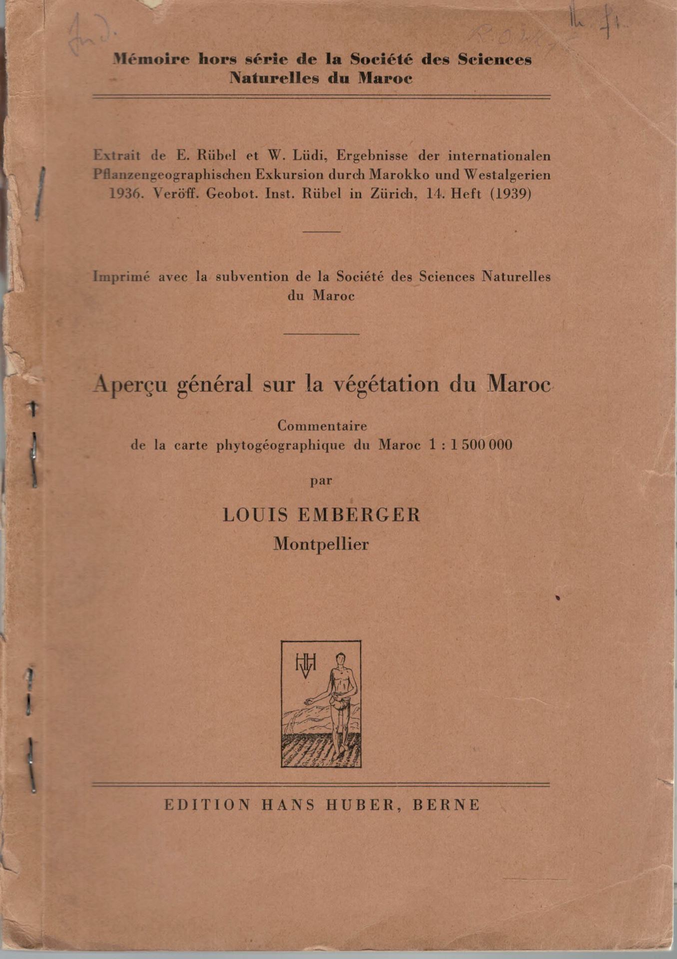 Apercu général sur la végétation du Maroc. Commentaire de la carte phytogéographique du Maroc 1: 1.500.00. 1939. ( Veröff. Geobot. Inst. Rübel in Zürich, Heft 14). 1 foldg. col. map. 117 p. gr8vo. Paper covers.