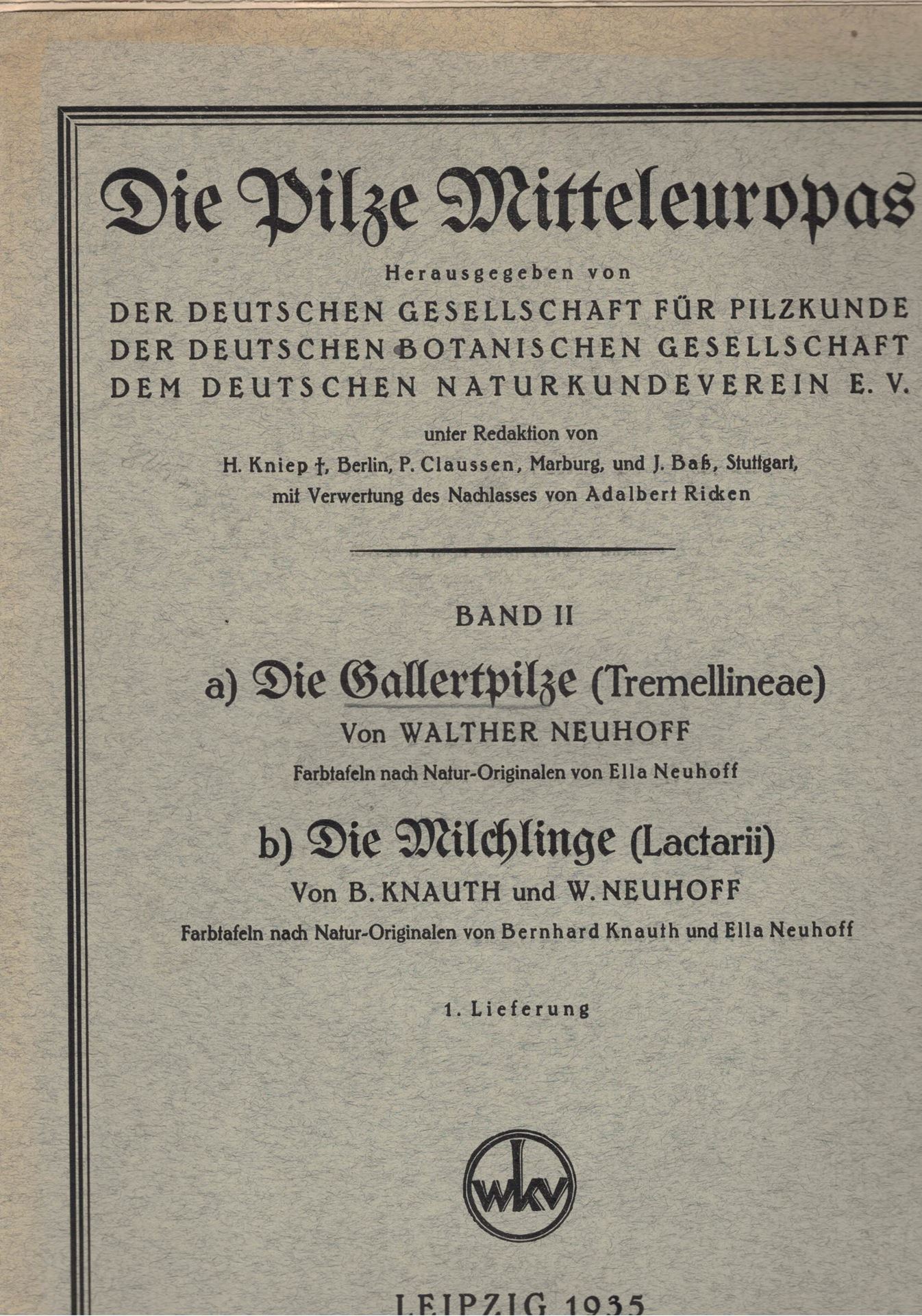 Band II: Gallertpilze (Tremellineae) von Walther Neuhoff) und Milchlinge (Lactarii) von B. Knauth und W. Neuhoff. 1935. 4to. In Mappen.