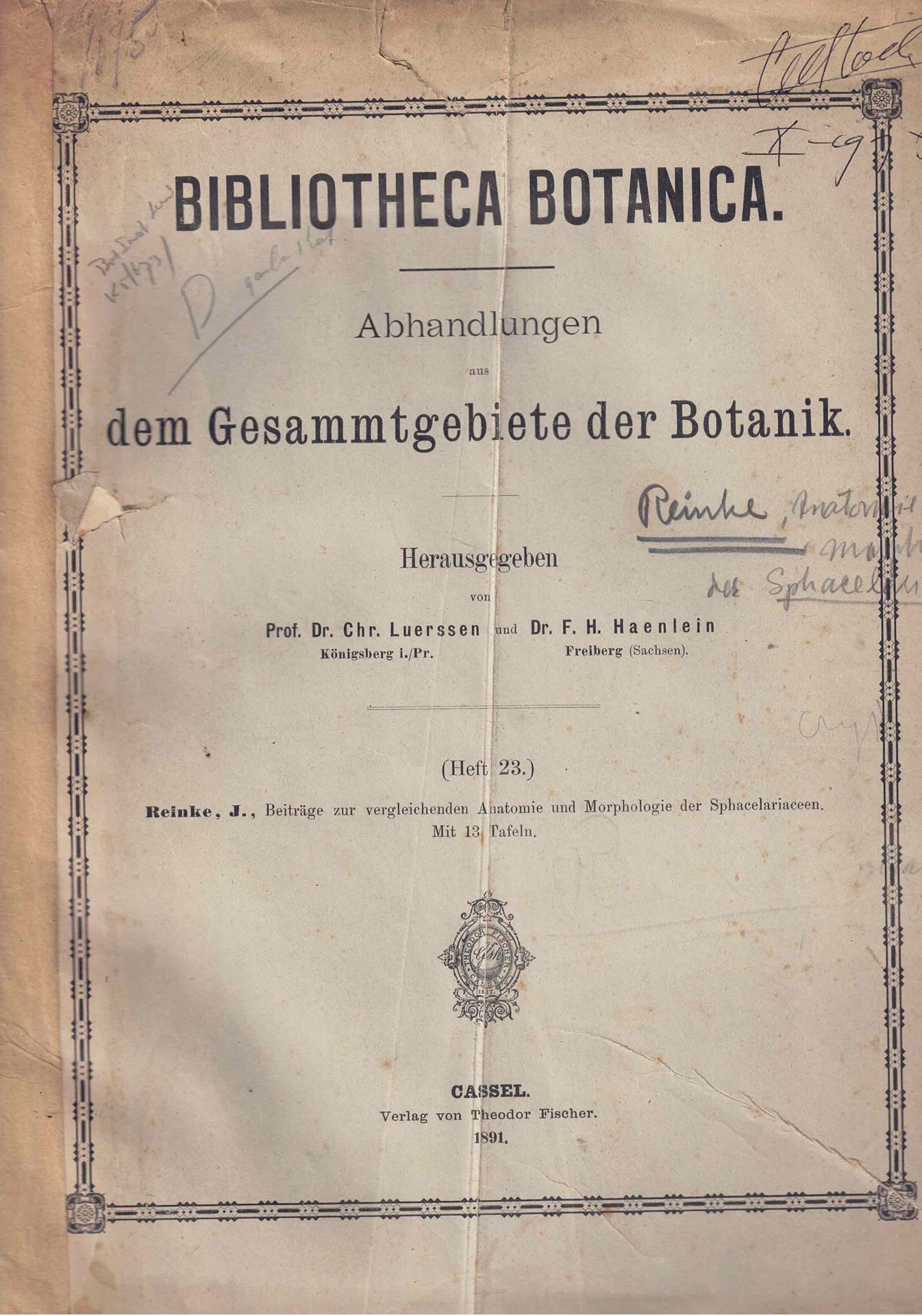 Beiträge zur vergleichenden Anatomie und Morphologie der Sphacelariaceen. 1891. (Bibliotheca Botanica, 23). 13 Tafeln. 40 S. 4to.- Originalbroschur.