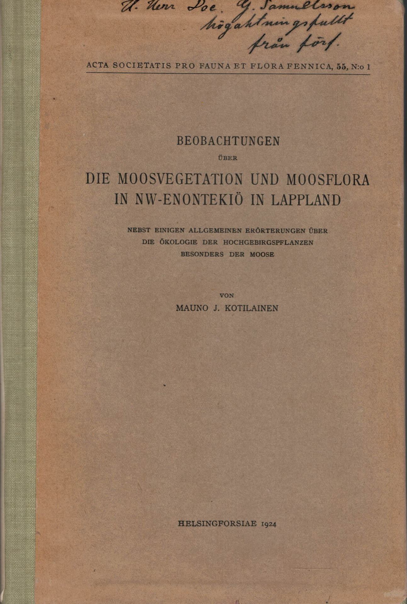 Kotilainen, Mauno J.: Beobachtungen über die Moosvegetation und Moosflora in NW- Enontekiö in Lappland. 1924. (Acta Soc. pro Fauna et Florafennica, 55:1). 1 map. 68 p. gr8vo. Hardcover. (87052) 22.47