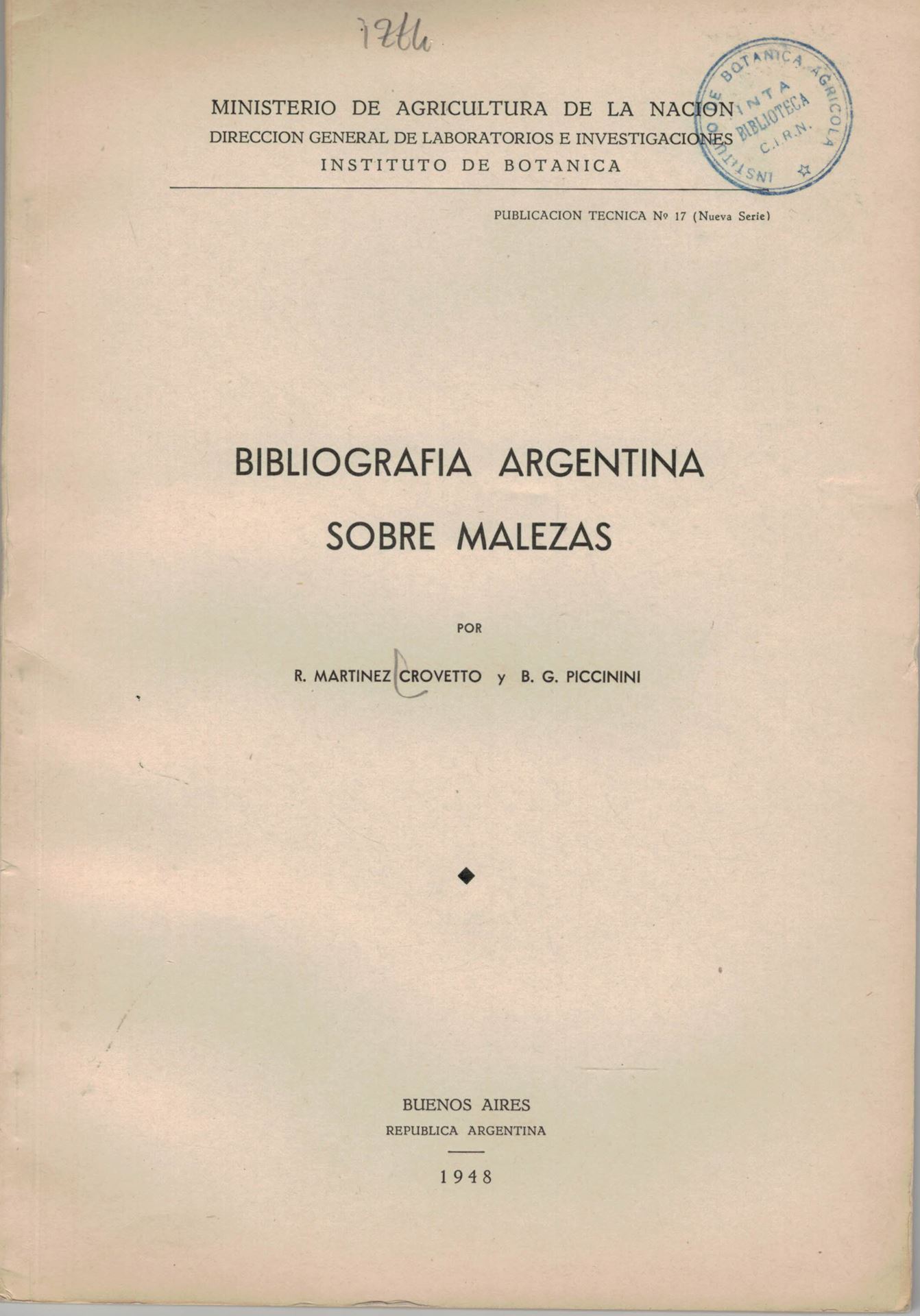 Bibliografia Argentina sobre Malezas. 1948. (Publicacion Tecnica, no. 17, Nueva Serie). 91 p. gr8vo. Paper bd.