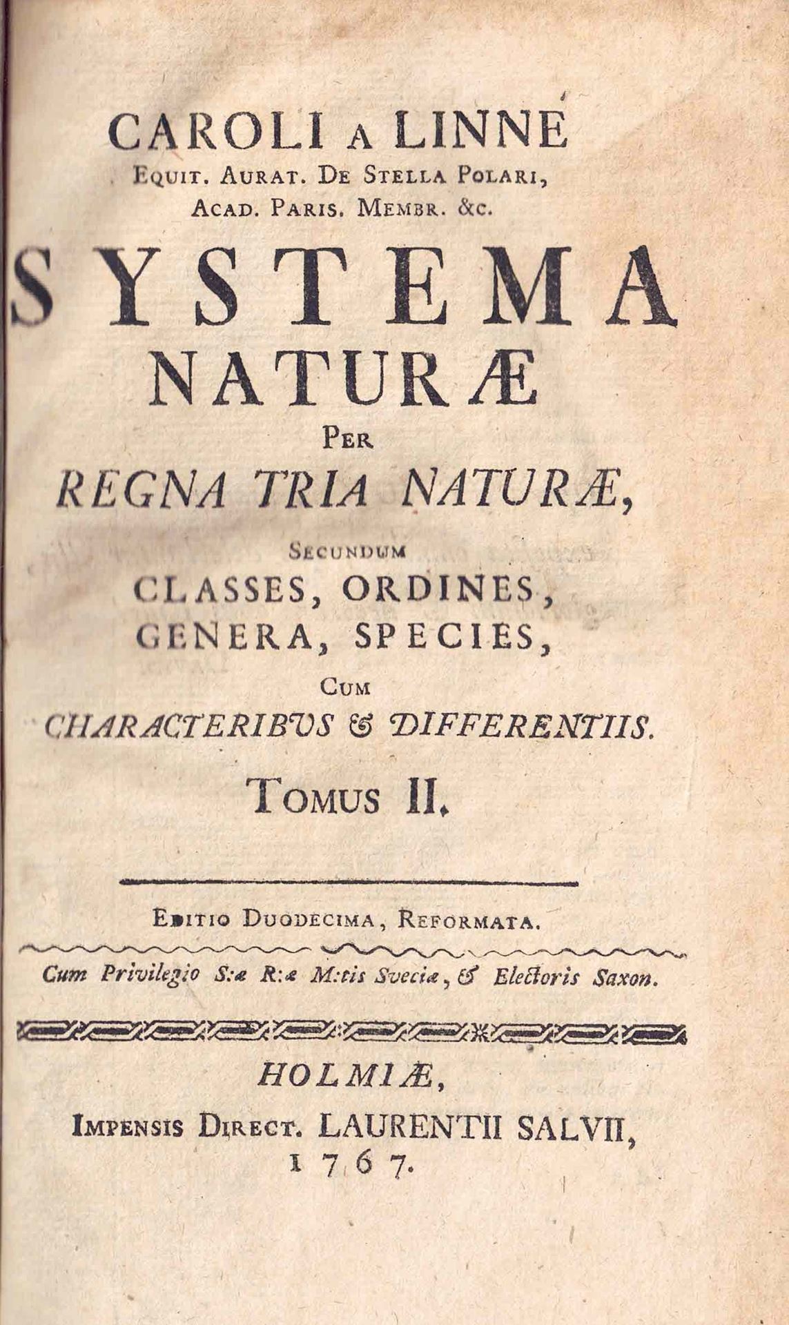 Caroli a Linné Systema Naturae per Regna Tria Naturae Secundum Classes, Ordines, Genera, Species cum Characteribus & Differentiis. Tomus II. Editio Duodecima, Reformata. Holmiae 1767, Impensis Direct. Laurentii Salvii. 736, 17 (Index Generum), - Bound with: Mantissa Plantarum. Generum editionis VI et Specierum editionis II. Holmiae 1767. 142 p. & 2 p. Index Mantissae. gr8vo. Leather.