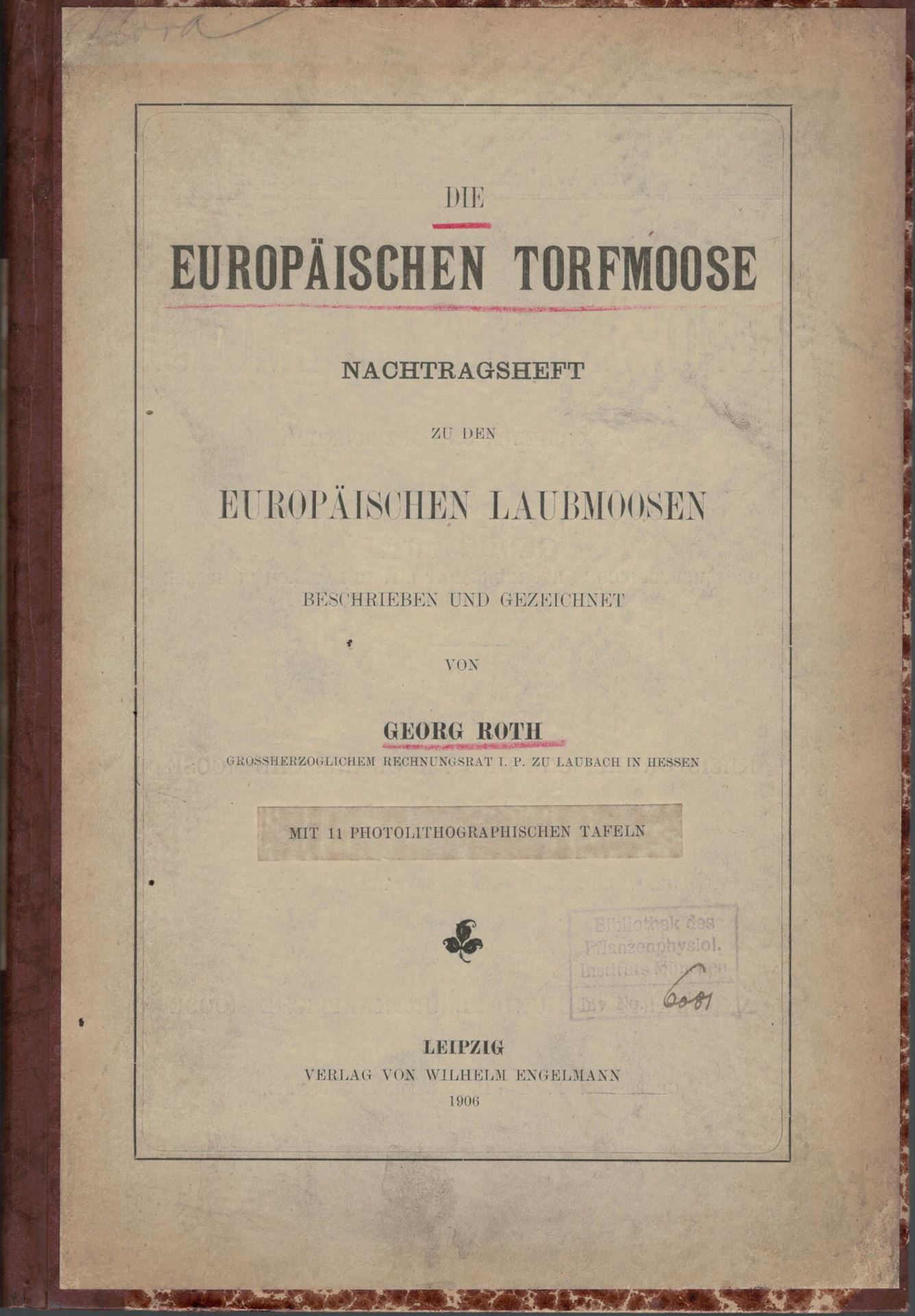 Roth, Georg: Die Europäischen Torfmoose. Nachtragsheft zu denEuropäischen Laubmoosen. 1906. 11 Tafeln. 80 S. gr8vo. (23556) 37.45