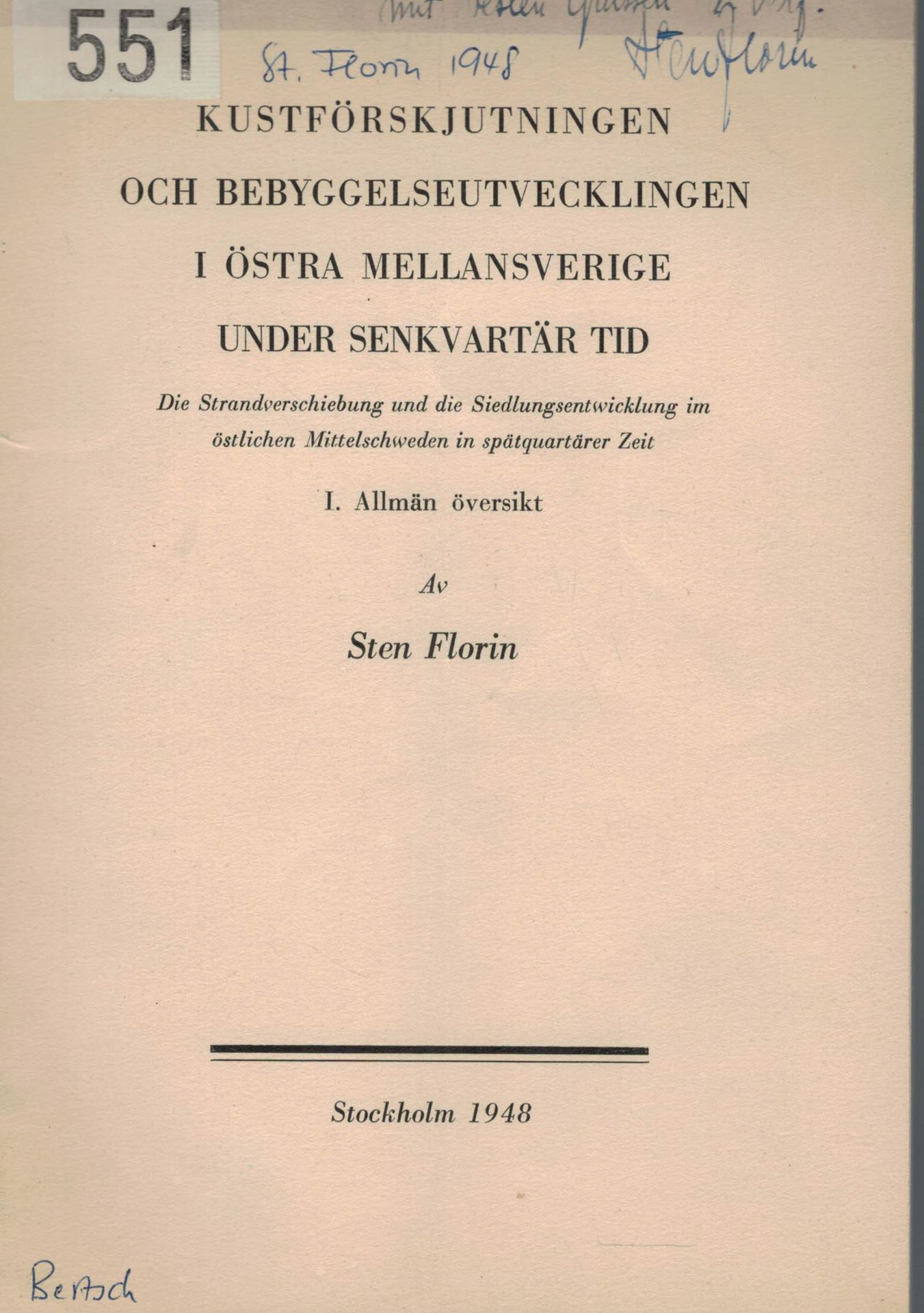 Florin,Sten: Die Strandverschiebung und die Siedlungsentwicklung im oestlichen Mittelschweden in spaetquartaerer Zeit.I:Allmaen oeversigt. 1948.1 Tafel.92 S.gr8vo.Broschiert.-In Schwedisch,mit deutschem Resume. (23591) 26.75