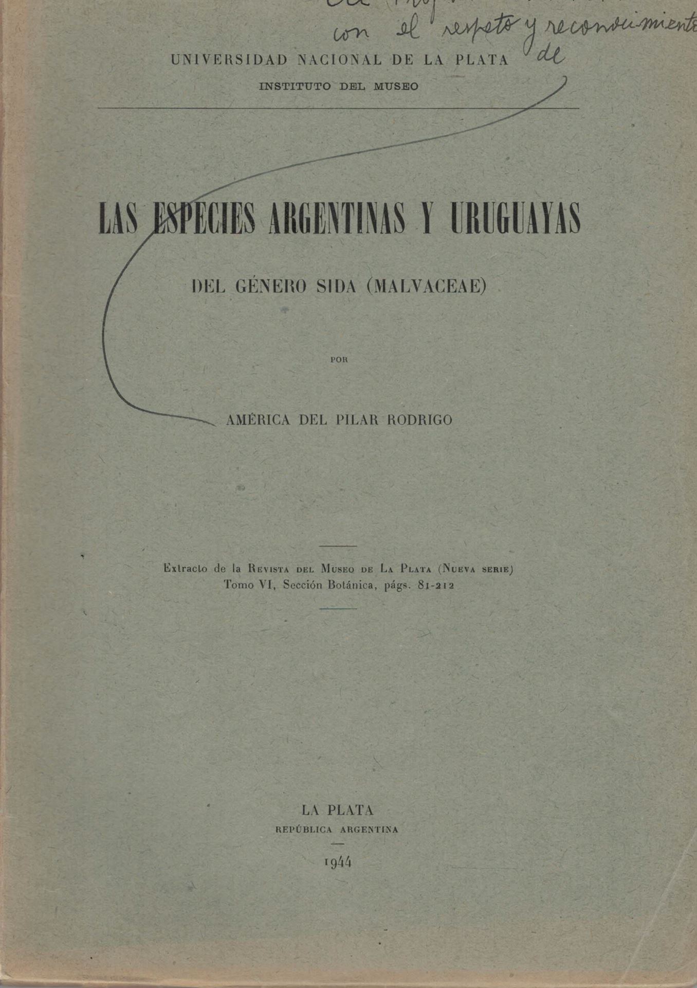 Pilar Rodrigo, America del: Las Especies Argentinas y Uruguayas del Genero Sida (Malvaceae). 1944. (Instituto del Museo de la Universidad Nacional de la Plata, Revista del Museo de la Plata, Nueva Series, Tomo VI, Botanica No. 24). 31 pls. 42 figs. 212 p. gr8vo. Paper bd. 31.03 (83569)