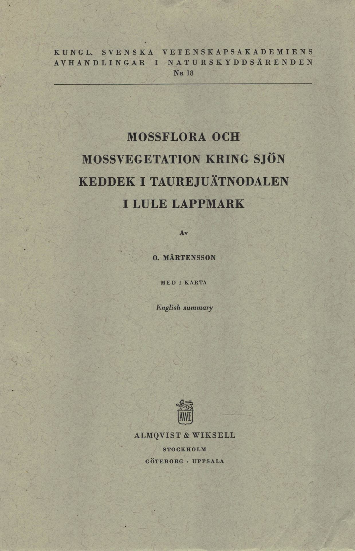 Mossflora och mossvegetation kring sjoen keddek i taurejuaetnodlaen i lulue Lappmark. 1962. (Kgl.Sv.Vet.Akad.Handlgr. i Naturskyddsaerenden No. 18). 1 map. 71 p. 4to. In Swedish, with English summary.
