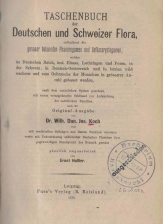 Koch, Wilh. Dan. Jos.: Taschenbuch der Deutschen und Schweizer Flora nach der Originausgabe....gänzlich umgearbeitet von Ernst Hallier. 1878. XVI, 802 S. 8vo. Leinen. (87890) 21.00