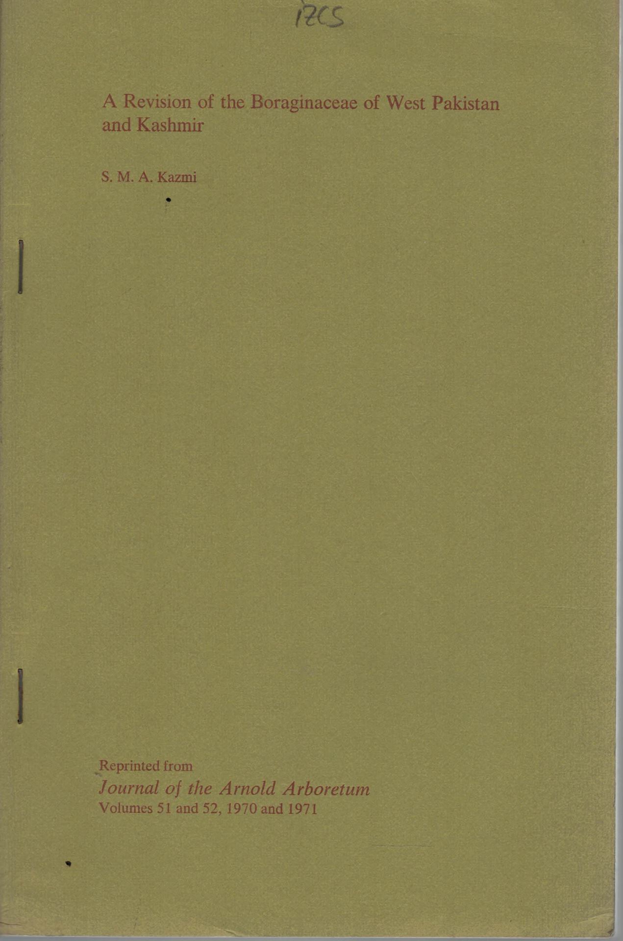 A revision of the Boraginaceae of West Pakistan and Kashmir. 2 parts (in 1). 1970-1971. (Jl. Arnold Arboretum, 51 & 52). 228 p. gr8vo. Paper bd.