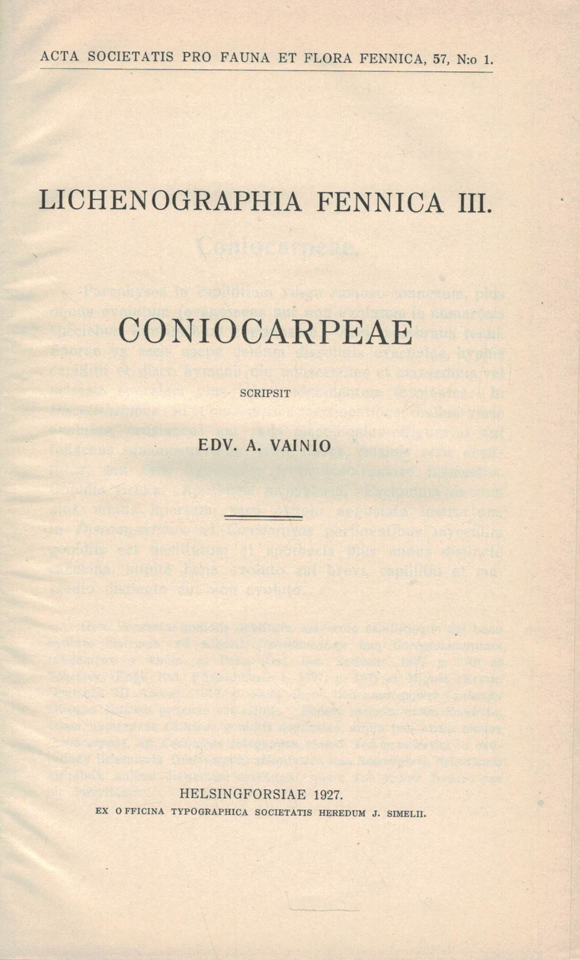 Lichenographia Fennica. Vol. 3: Coniocarpaceae. 1928. 138 p. gr8vo. Hardcover.