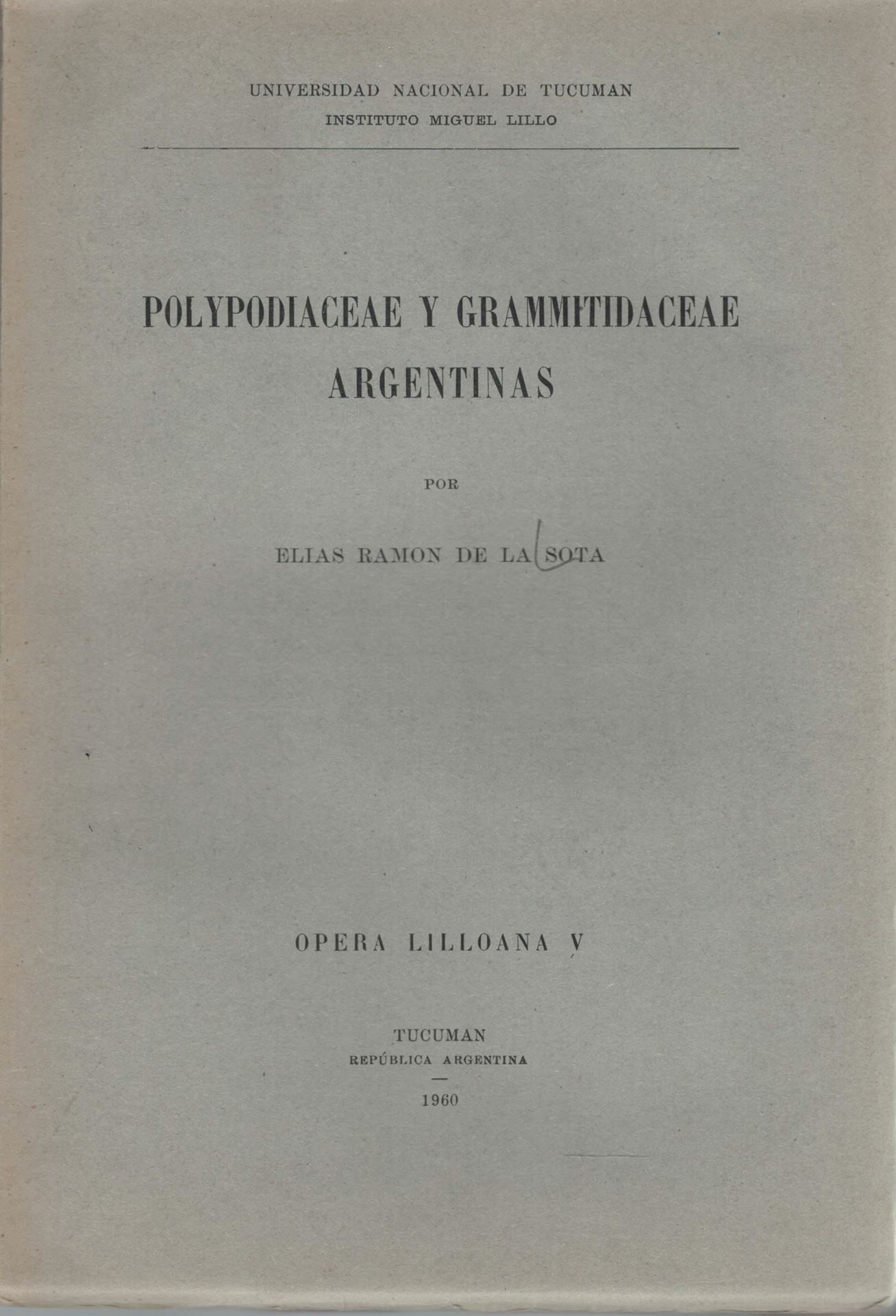 SOTA, Elias de la: Polypodiaceae y Grammitidaceae Argentinas. 1960. (Op.Lilloana,5). 4 maps. 38 figs. 229 p. Paper bd. gr8vo. With English summary. (9572) 34.24