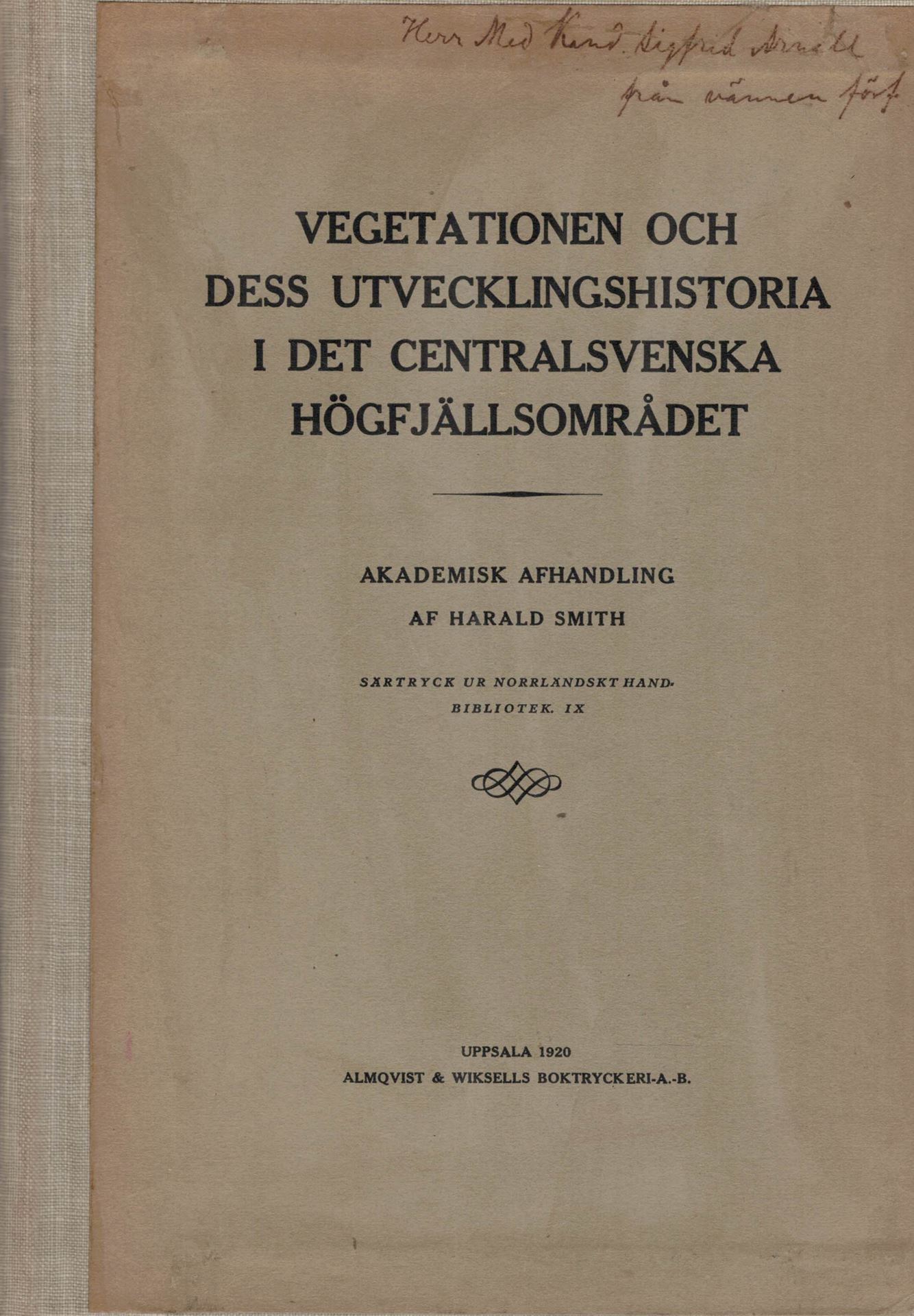 Smith, Harald: Vegetationen och dess Utvecklingshistoria i det Centralsvenska Högfjällomradet. 1920. 2 foldg. maps. 41 figs. 238 p. gr8vo. Hardcover. (87454) 38.00
