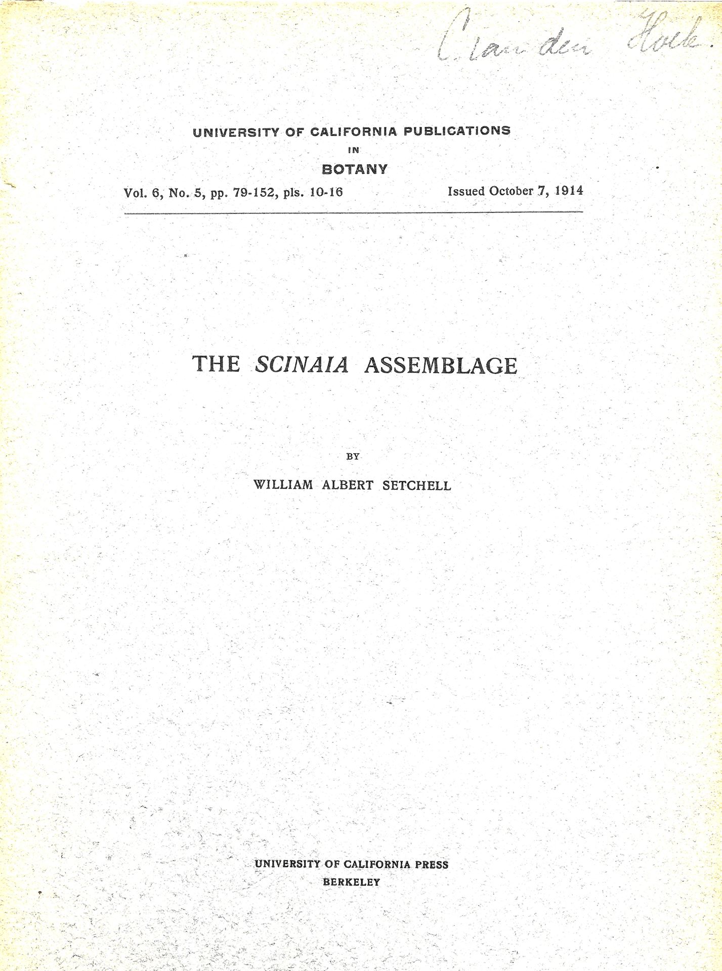 1: The Scinaia Assembledge. 1914. (Univ. Calif. Publ.Botany,6:5). 7 pls. 74 p./ 2: The Genus Microdictyon. 1929. (Univ .Calif. Pibl. Botany,14:20). 105 figs. 136 p. / 3: Some early algal confusions,II. 1933.(Univ. Calif. Publi. Botany, 17:9). 20 pls. 68 p.