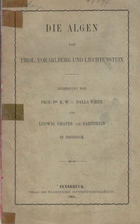 Dalla Torre, K. W. und Ludwig Graf von Sarntheim: Die Algen von Tirol, Vorarlberg und Liechtenstein. 1901. (Flore der Gefürsteten Grafschaft Tirol..., Band 2: Algen). XXII, 210 S. Broschiert. (105445) 43.00