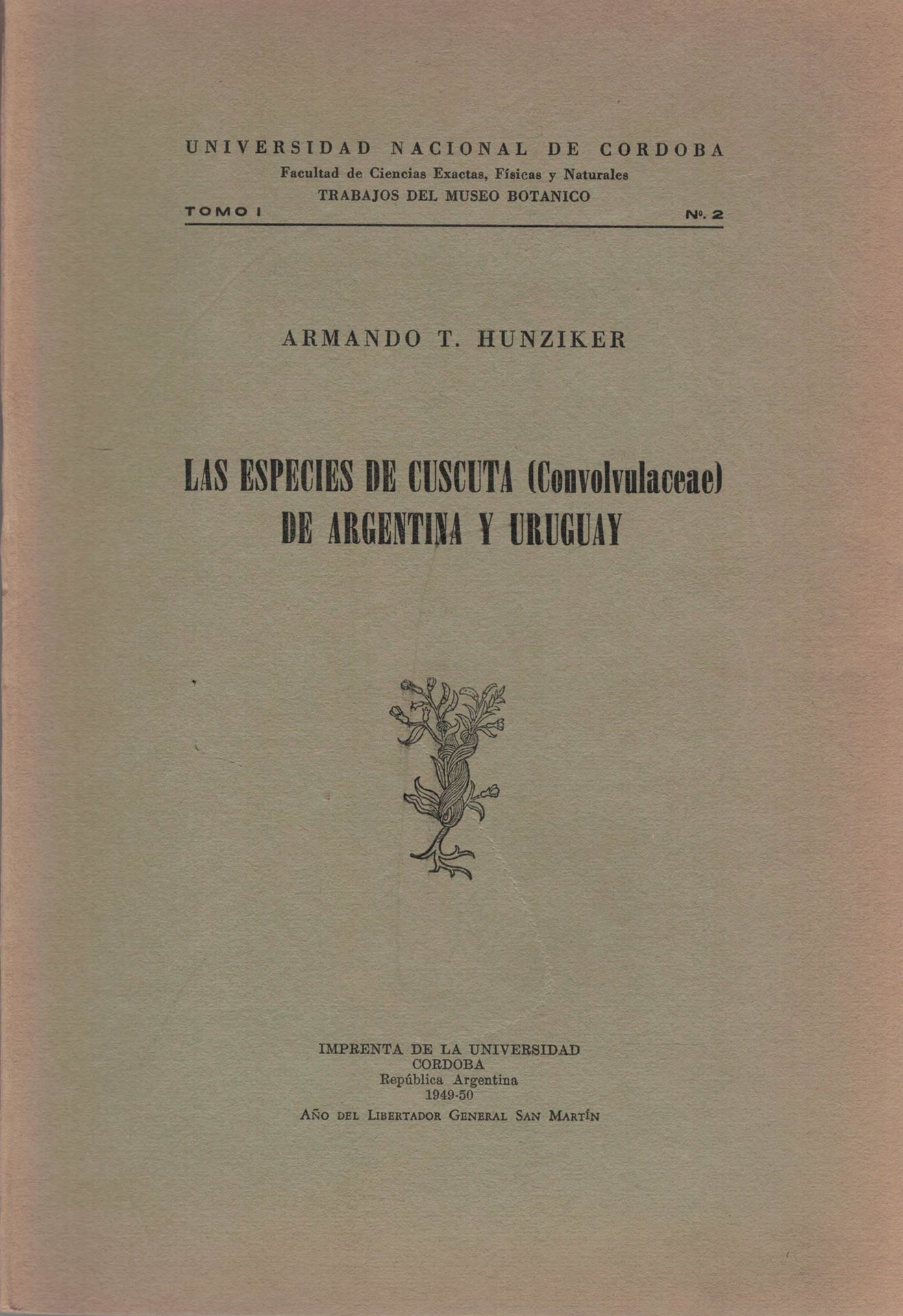 Hunziker, A.: Las Especies de Cuscuta (Convolvulaceae) de Argentina y Uruguay. 1949. (Trabajos del Museo Botanico, Fac. Cincias Exactas, Fisicas y Naturales, Univ, Nac. de Cordoba, Vol. 1:2). 41 figs. 352 p. gr8vo. Paper bd. (92947) 59.92