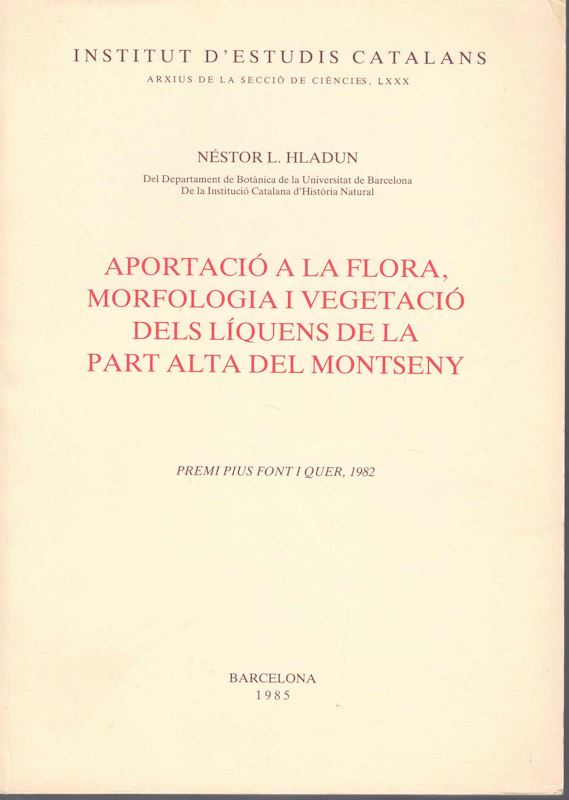 Apotació a la Flora, Morfologia i Vegetació Desl Liquens de la Part Alta del Montseny. 1985. (Inst. d'Estudis Catalans, Arxius de la Seccio de Ciencies,LXXX), 204 p. gr8vo. Paper bd. - In Catalan.