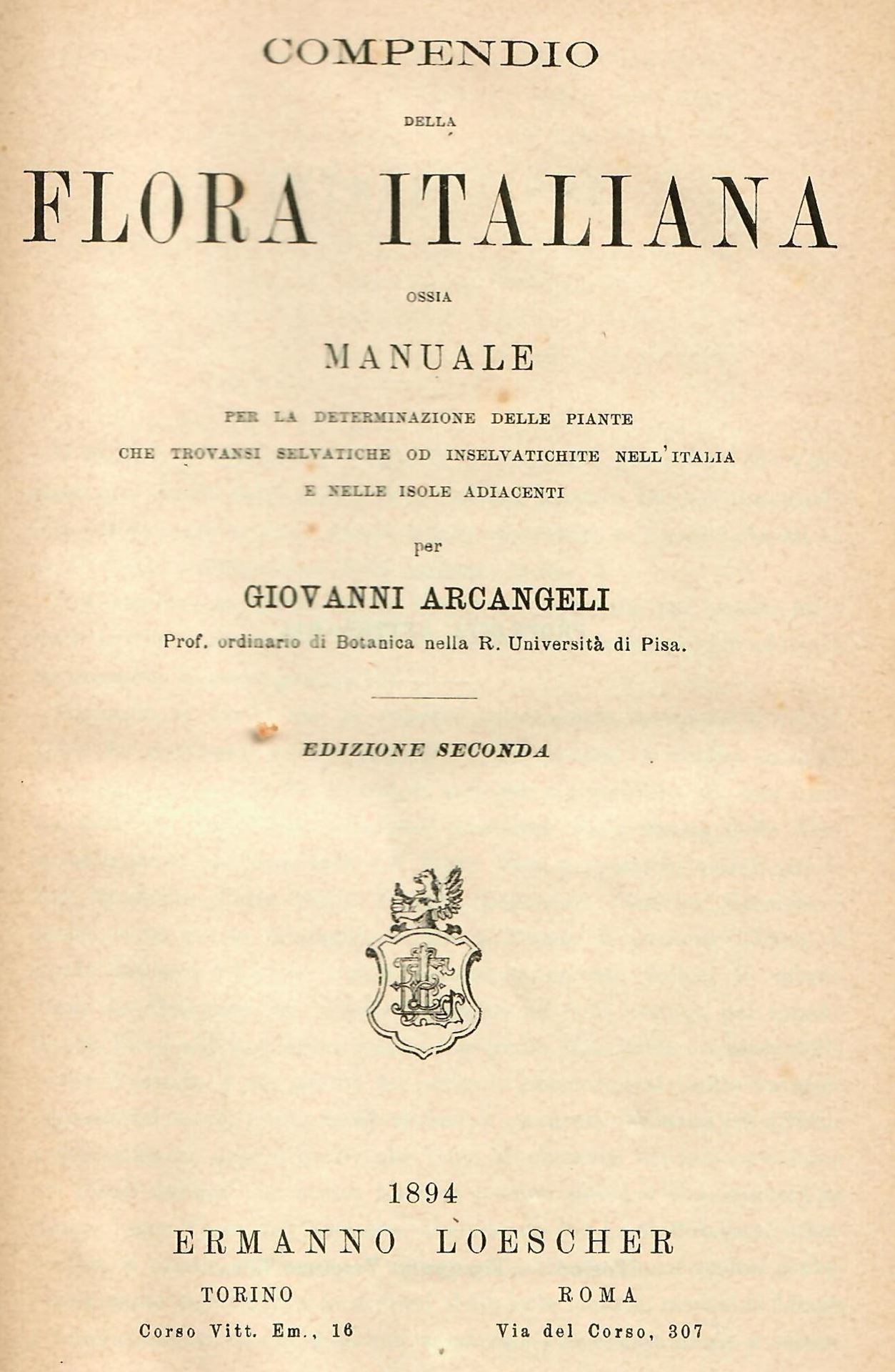 Arcangeli, Giovanni: Compendio della Flora Italiana ossia Manuale per le Determinazione delle Piante che Trovansi Selvatiche od Inselvatiche Nell'Italia e Nelle Isole Adiacenti. 1894. XX, 836 p. Halfcloth. (106181) 67.41