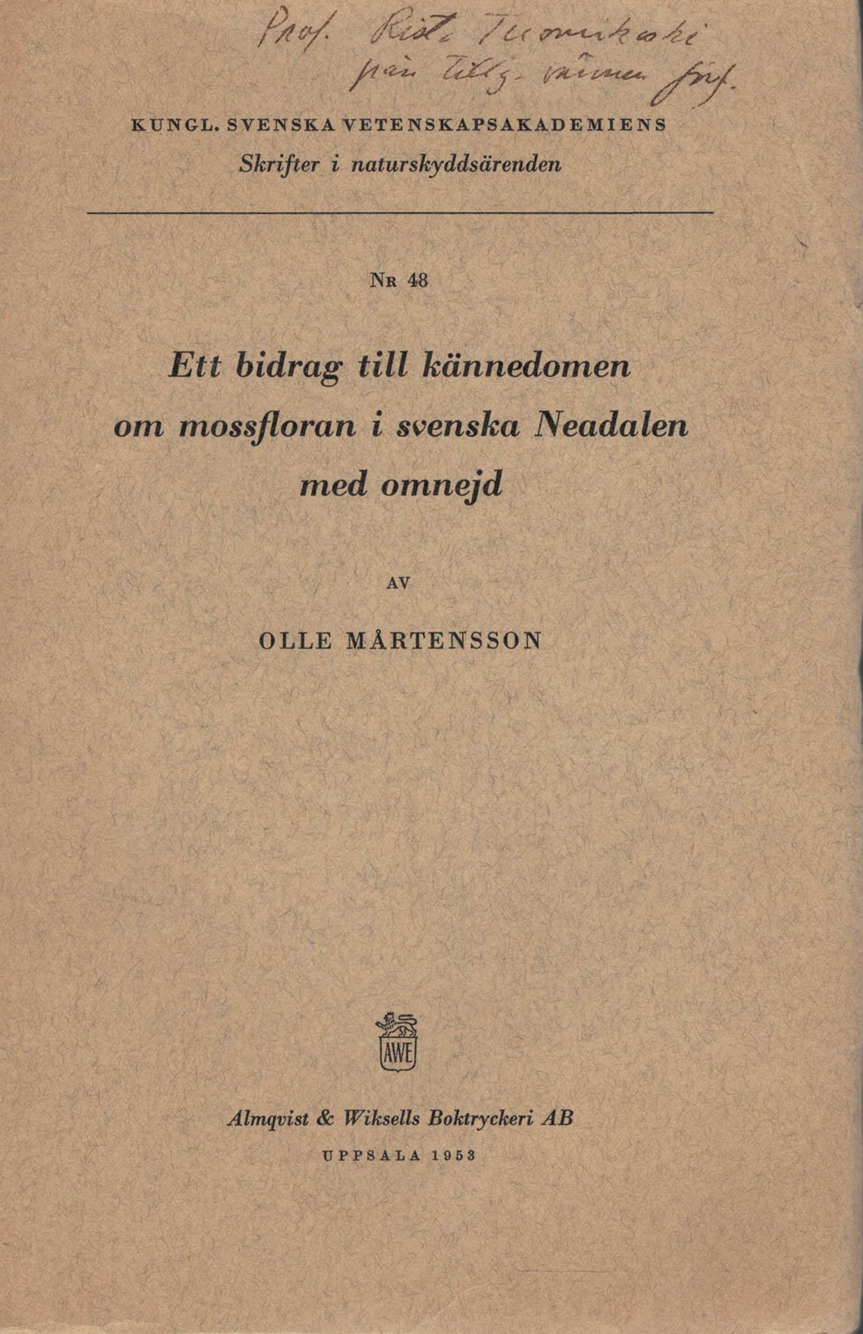 Ett bidrag till kännedomen om mossfloran i svenska neadalen med omnejd. 1953. (Kungl. Svenska vet.-ak. Skrifter in naturskyddsärenden). 96 p. gr8vo. Paper bd.