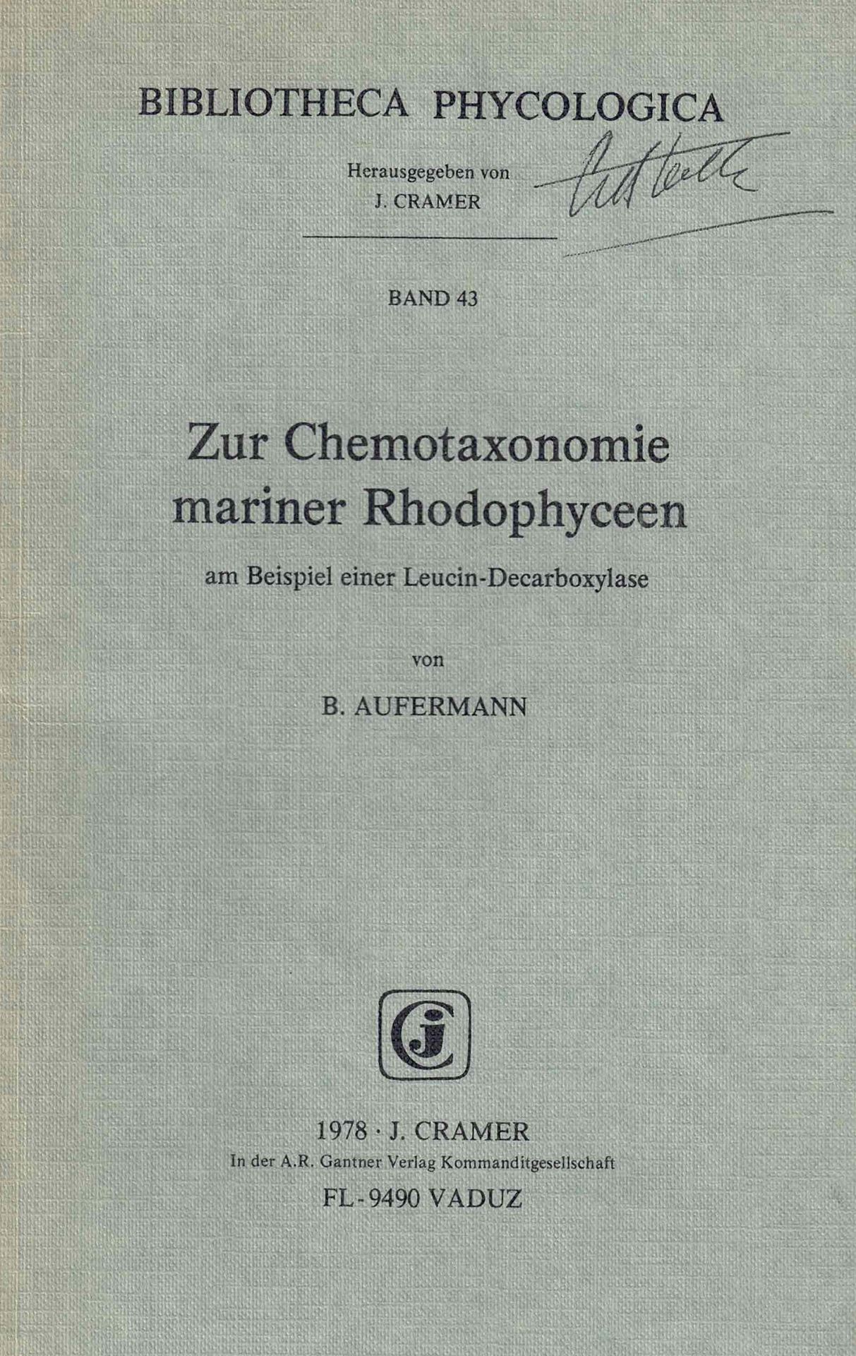 Aufermann, B.: Zur Taxonomie mariner Rhodophyceen am Beispiel einer Leu- cin.Decarboxylase.Vergleichende Untersuchungen ueber Verbreitung und Substratspektren einer unspezifischen Leucin-Decarboxylase bei marinen Rotalgen im Hinblick auf ihre chemotaxonomische Bedeutung.1978.(Bibl. Phycolog.43)17 Tab.17 Fig.126 S.gr8vo.Paper bd.(84369) 16.05 (ISBN 3-7682-1206-8)